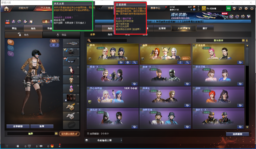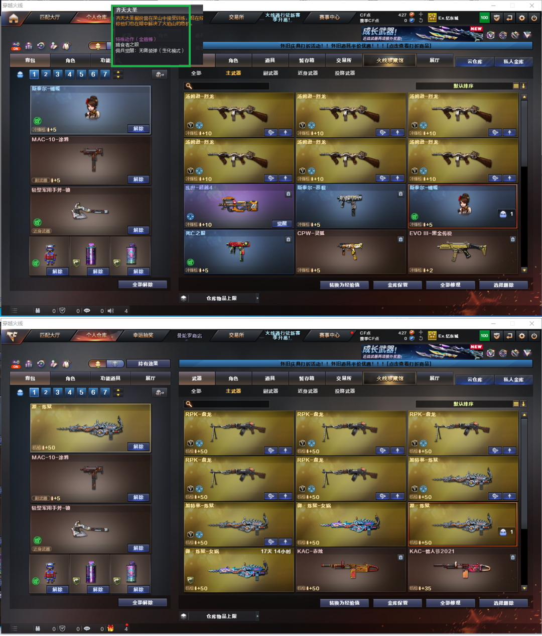 装备描述:排位:可以、、、、、、、、生化全装(可以变更背包、看僵尸血量):无需换弹、6烈5盘、炼狱、斯泰尔蝴蝶、死亡之眼、MAC-涂鸦、手斧镜、生化雷、超级对讲机、、、、、、、爆破四防:幻神、2个COP堕天神、COP幻灵、白虎、QBZ金色蔷薇、、、生化人物(齐天大圣)爆破四防(王者涂鸦、影豹)
