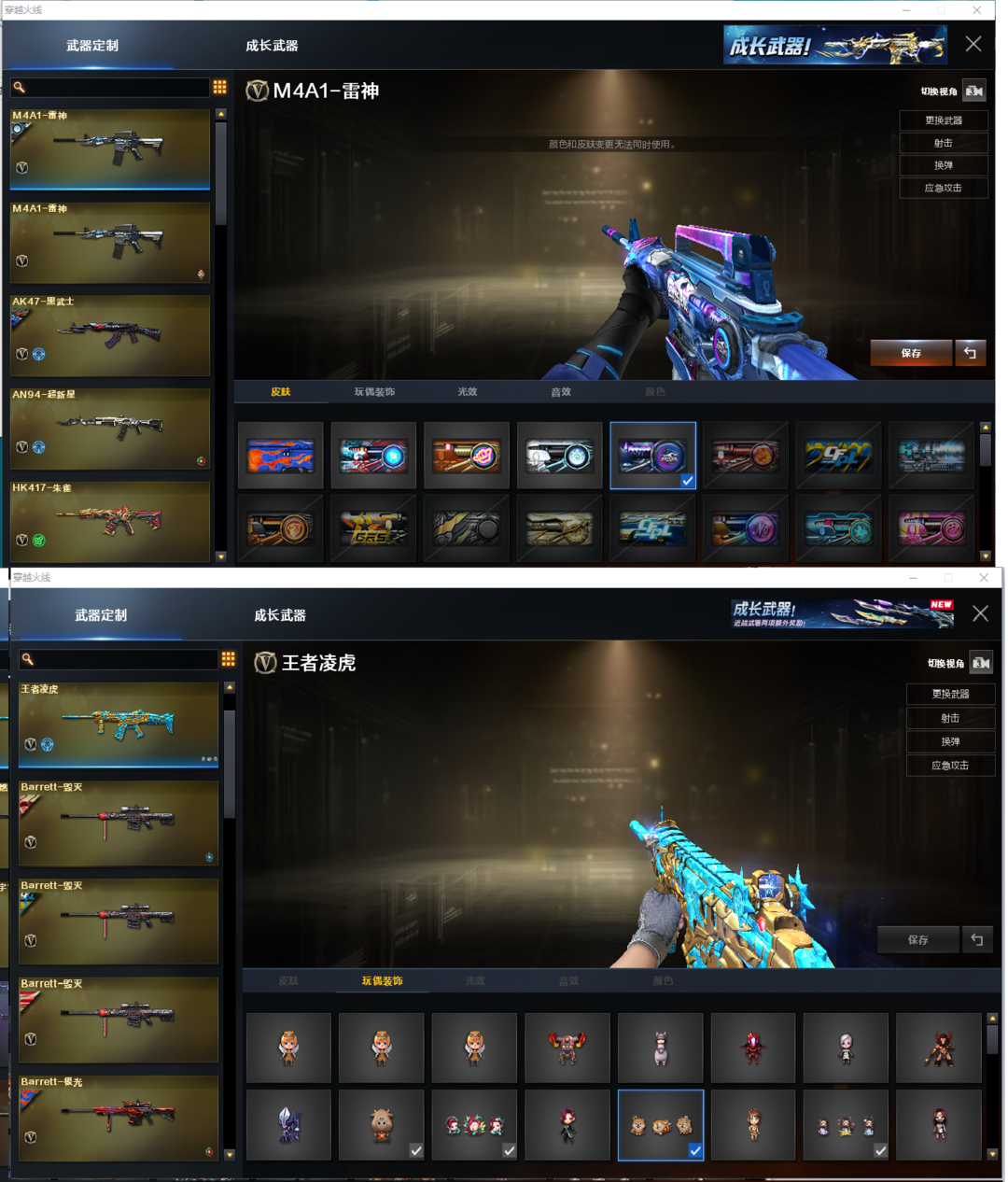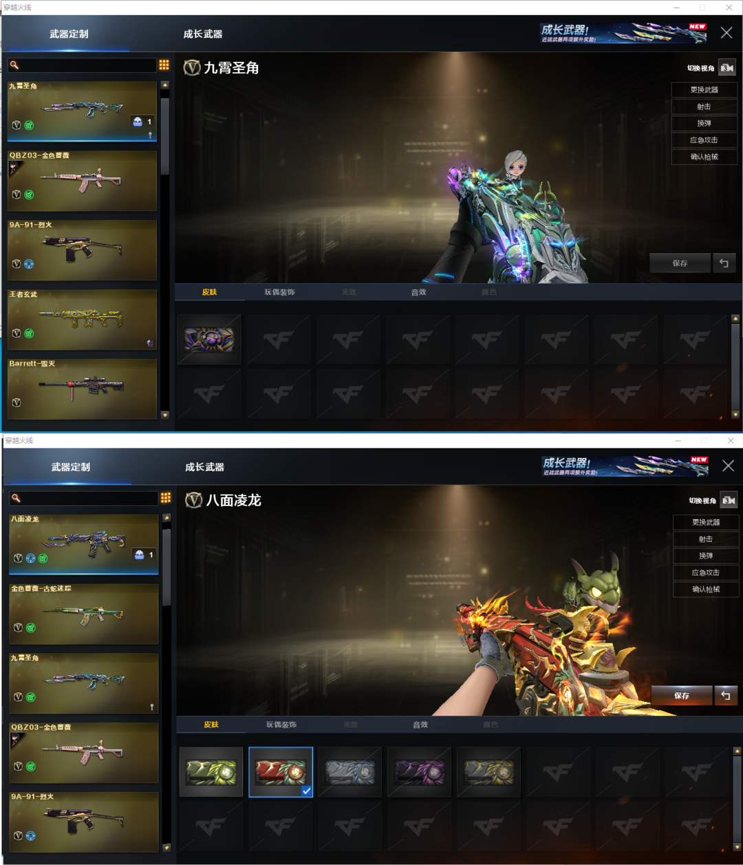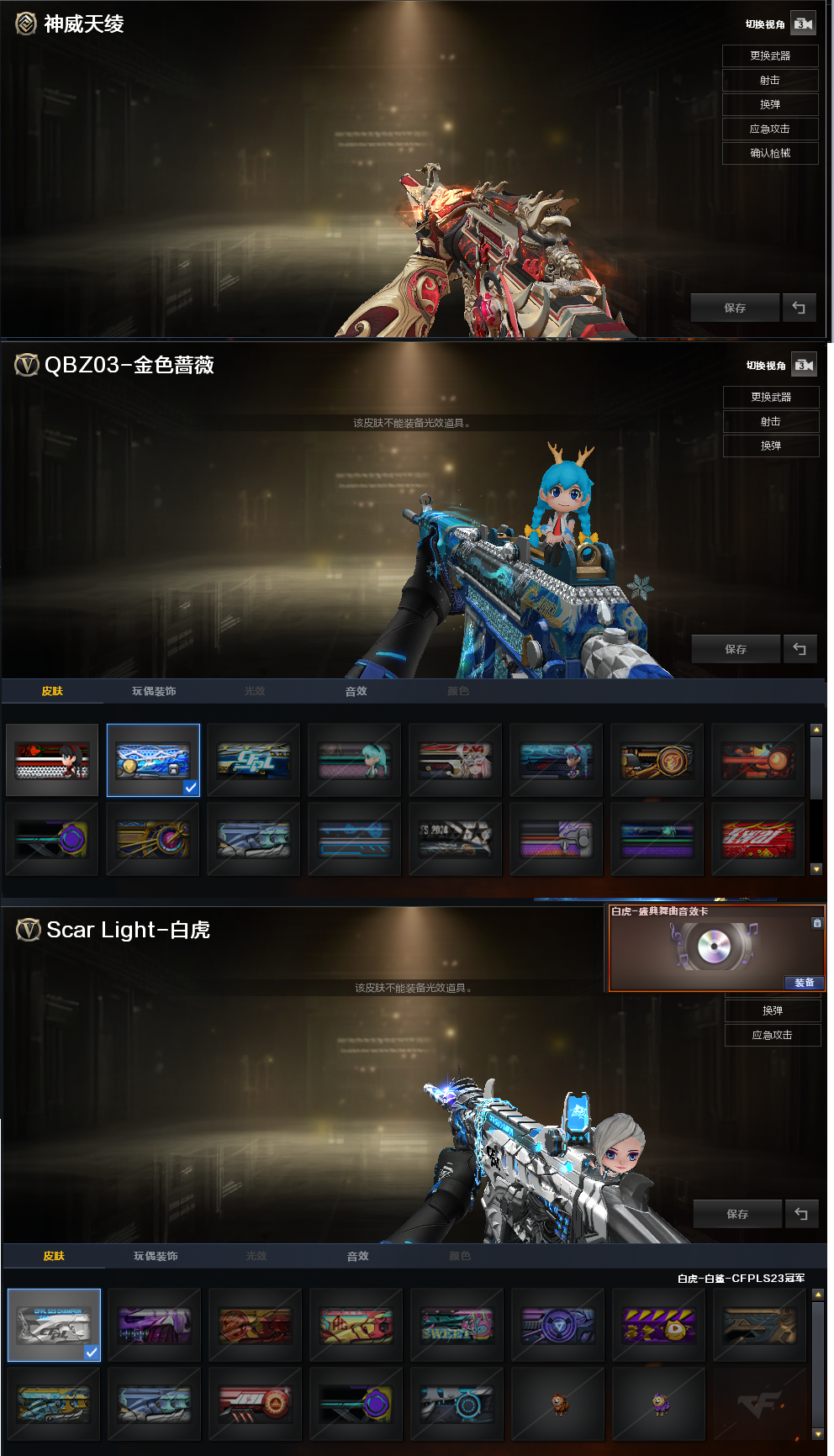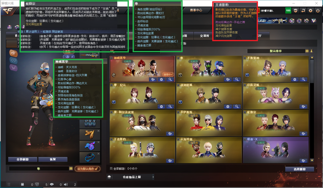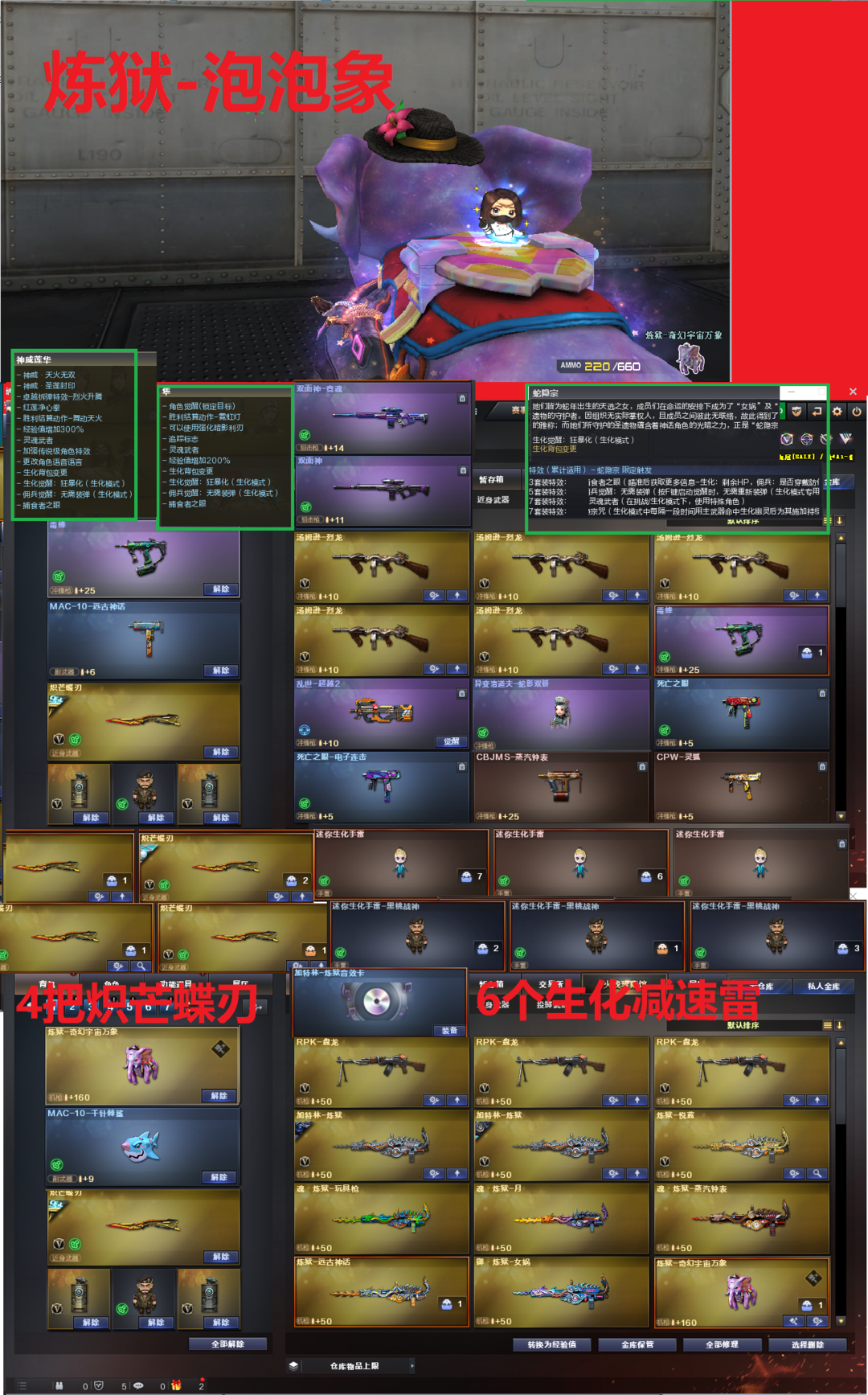 装备描述:排位:可以、、、、、、、生化四防:(可以变更背包、查看生化僵尸血量):无需换弹、5烈4盘4炼狱、炼狱音效、炼狱-宇宙万象、八面凌龙、九霄圣角、双面神、毒蜂、异变清道夫-小人枪、死亡之眼、MAC涂鸦、4把炽芒蝶刃、手斧镜、超级对讲机、6个生化减速雷、生化常用弹匣、、、、爆破四防:幻神6皮(EP荣耀世冠、电竞之星、AG、23白鲨、白鲨、黄忠皮肤)、USP冥王、3个COP幻灵、23白鲨柯尔特、、、、神威天凌、裁决皮肤、王者凌虎、白虎、QBZ金色蔷薇、、、裁决音效、白虎音效、炼狱音效、屠龙音效、、、1套雷霆、2套幻灵、、、生化四防(神威莲华、隼、蛇隐宗)、爆破四防(王者影豹)