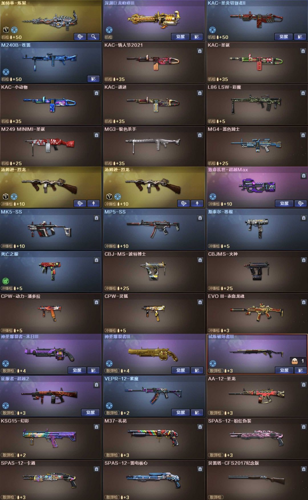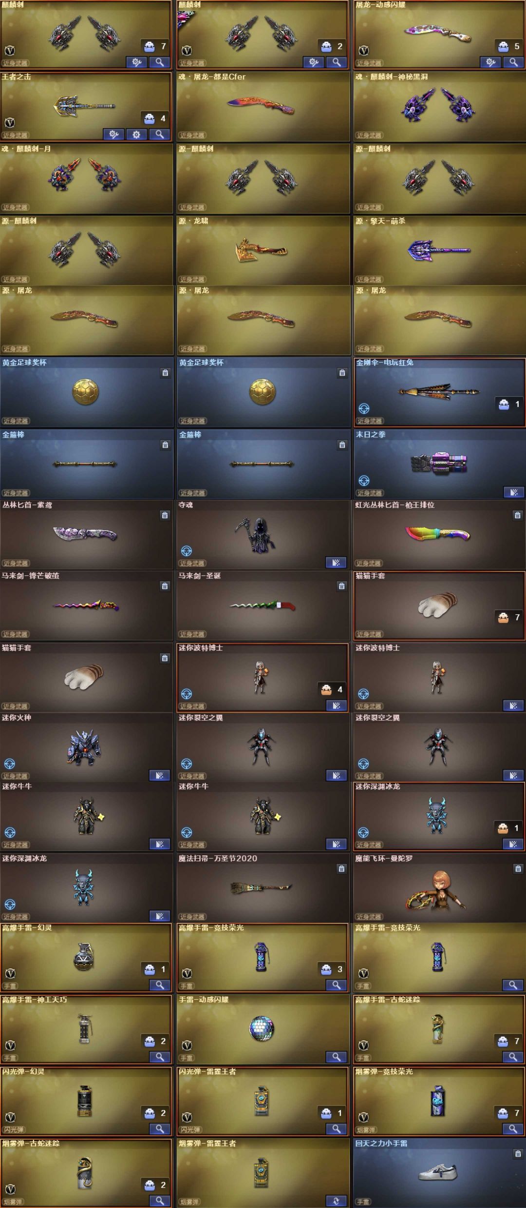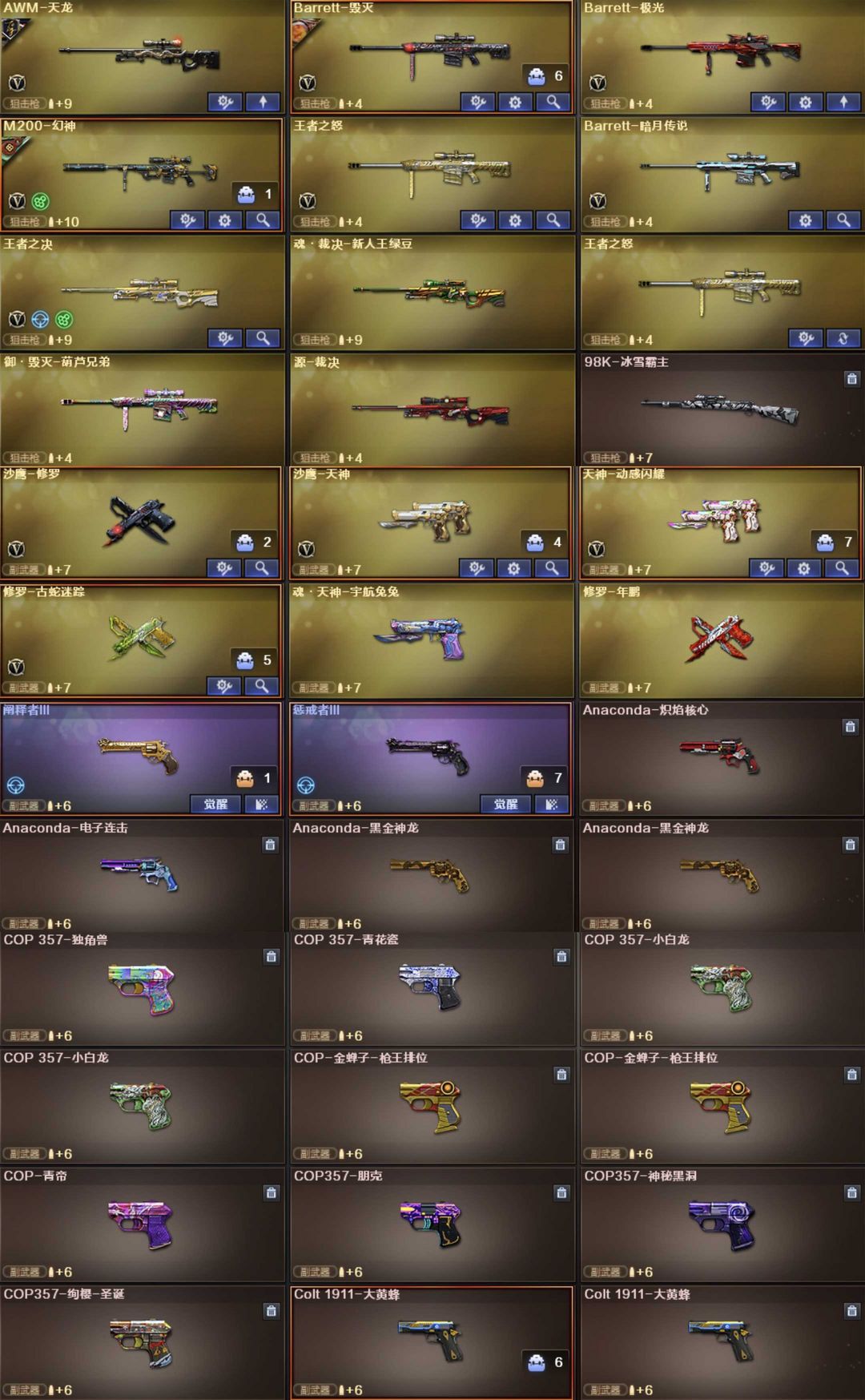 装备描述:超新星-悦享-觉醒版;王者之决-觉醒版;王者之戮-觉醒版;闪光弹-雷霆王者-觉醒版;烟雾弹-雷霆王者;王者之击-觉醒版;炫金黑龙;王者之怒-觉醒版;炫金火麒麟;王者之怒;王者之翼;者之魄 英雄武器:烈火-动感闪耀;屠龙-动感闪耀;天神-动感闪耀;手雷-动感闪耀;无影-神兵利器;高爆手雷-神工天巧;AK47-火麒麟;QBZ03-金色蔷薇;M200-幻神;白虎-电玩蓝兔;AK47-B-战神;M4A1-黑骑士;麒麟刺;Barrett-暗月传说;AWM-天龙;AK47-黑鲨;烟雾弹-竞技荣光;高爆手雷-竞技荣光;AK47-B-常胜将军;AK47-B-战士;高爆手雷-幻灵;闪光弹-幻灵;AK47-B-身先士卒;汤姆逊-烈龙;M4A1-雷神;黑骑士-海王;M4A1-武圣;加特林-炼狱;Barrett-极光;AK-47-猩红传说;AK47-黑武士;沙鹰-天神;AK12-天启;M4A1-黑龙;M4A1-龙血;沙鹰-修罗;Barrett-毁灭;M4A1-玫瑰精灵 角色:葵;猎狐者;飞虎队;幻影;复仇者;堕天使;活力灵狐;G.E.M.邓紫棋;夜玫瑰;威锋;陈龙野;陈龙野-X;新斯沃特-英特尔