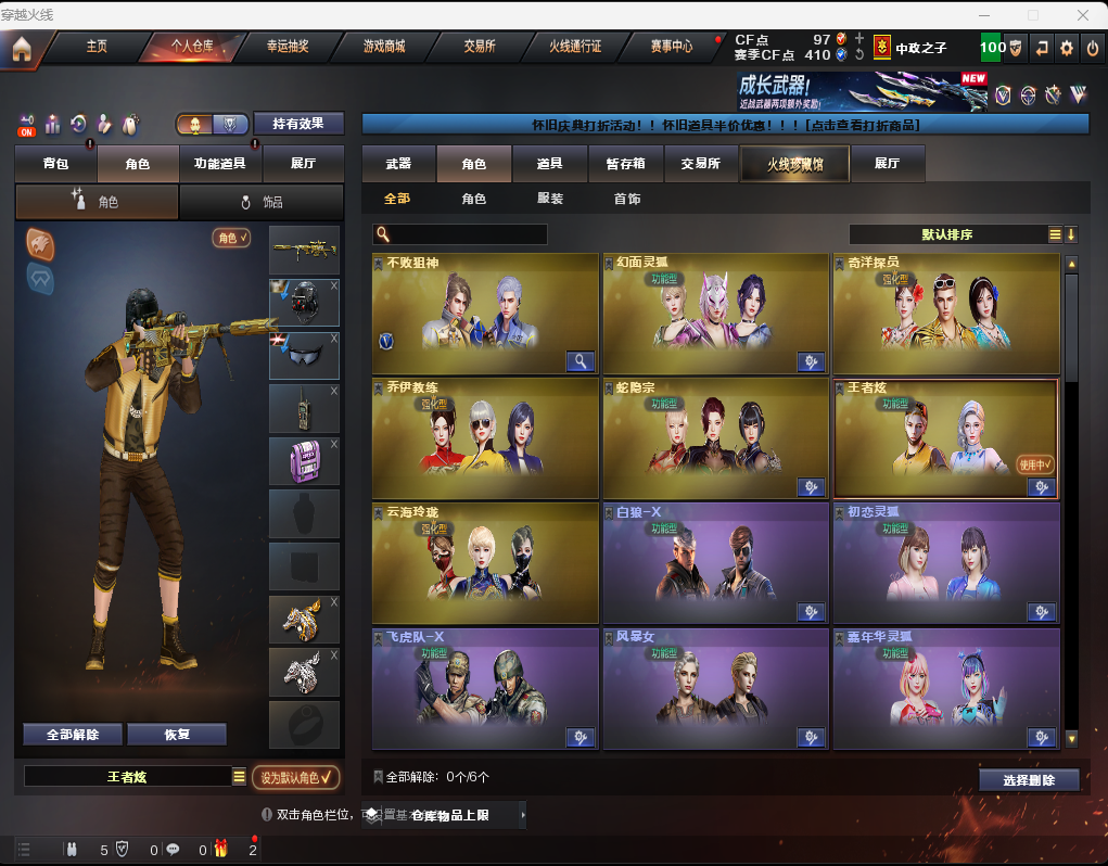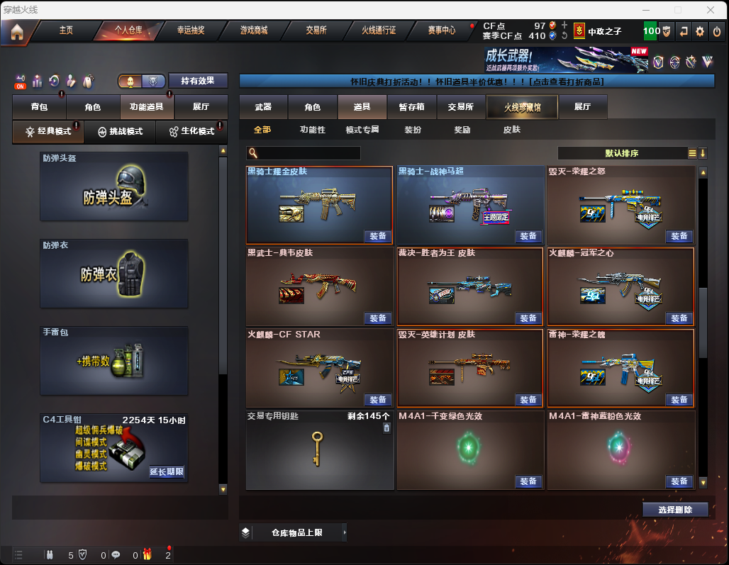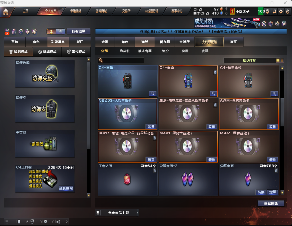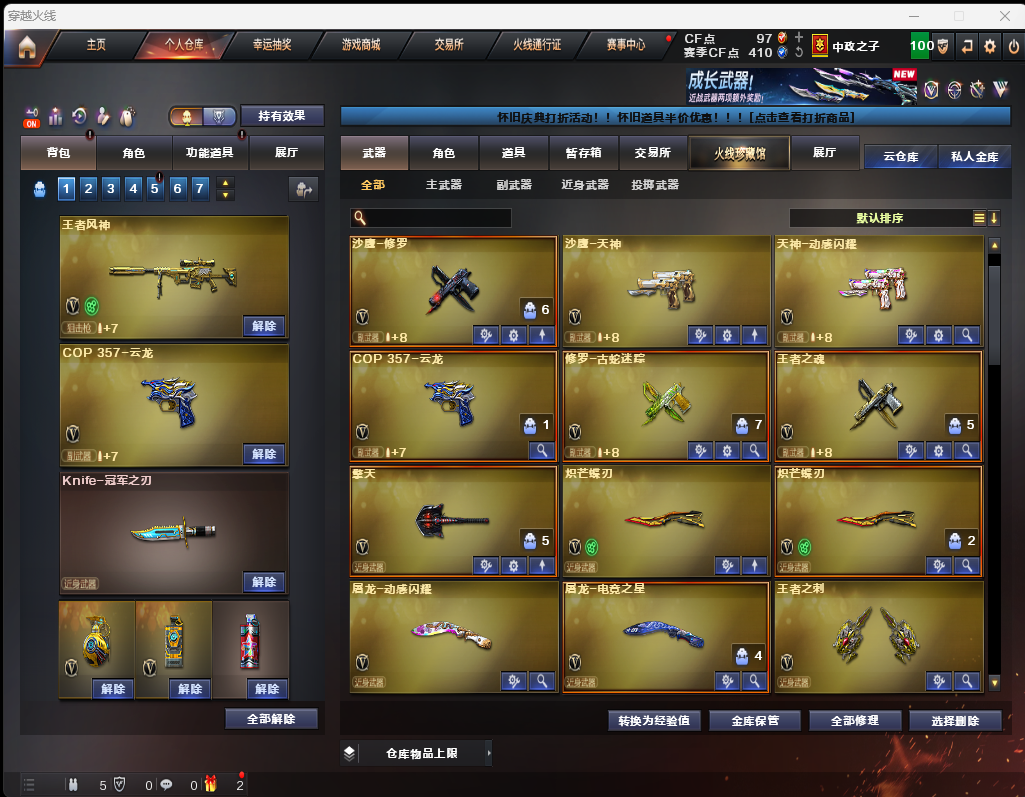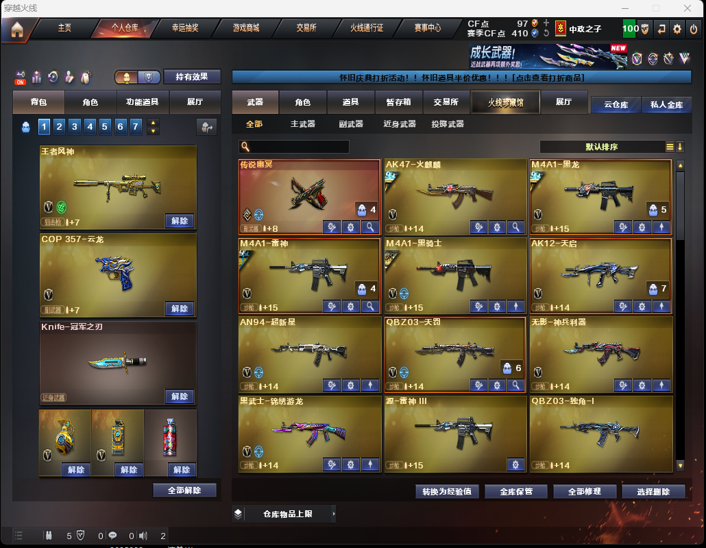 限制: 租号3次及以上 | 撤单率<50%才可租用此帐号装备描述:裁决音效卡传说幽冥❤️王者风神QBZ天罚COP云龙套蝴蝶刀*2冠军之刃⑤冠军皮拉丝皮荣耀套⑥音效