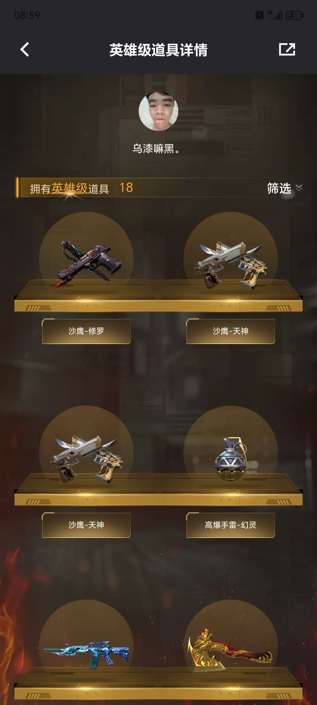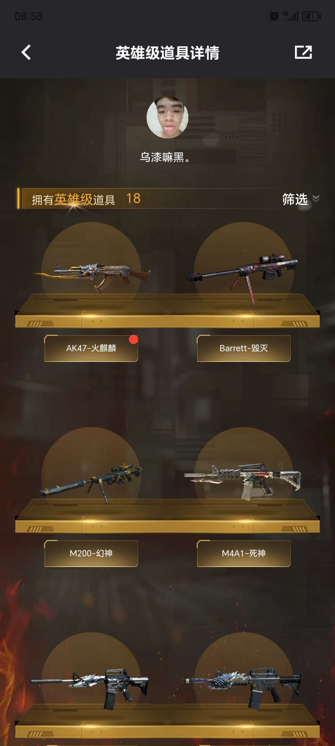 装备描述:[可排位]M200幻神,M4A1雷神,QBZ金色蔷薇,M4A1黑龙,Ak47火麒麟,M4A1死神,闪光灯雷霆王者2,雷霆王者之峰,高炮手雷幻灵,巴雷特毁灭,沙鹰修罗,沙鹰天神2,角色,樱青春偶像,潘多拉x,暗夜x。