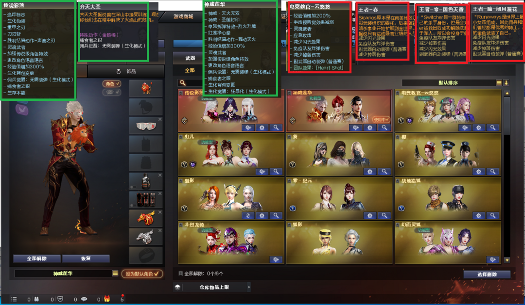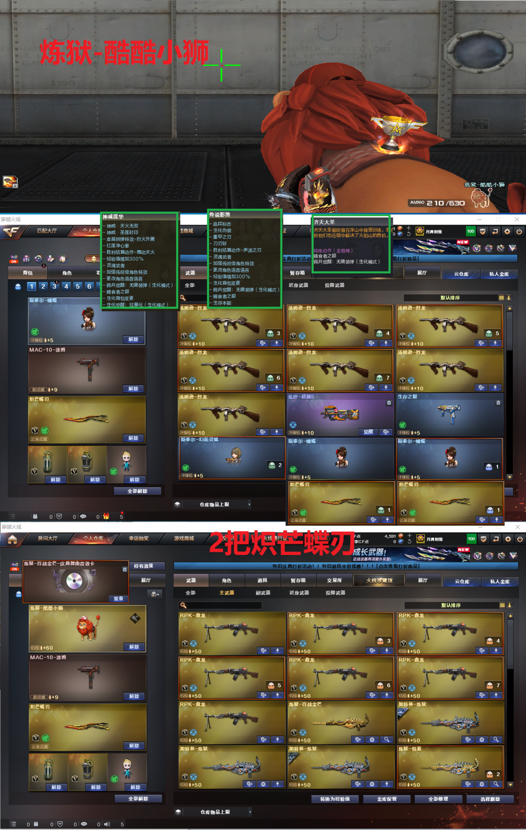 装备描述:排位:可以、、、、、、、、、生化四防精品号(生化模式换背包、可以查看僵尸血量)无需换弹、6烈、6盘龙、炼狱-酷酷小狮、斯泰尔蝴蝶、斯泰尔幻面灵狐、死亡之眼、MAC手枪、2个炽芒蝶刃、生化减速雷、超级对讲机、全部弹匣、、、、、、、、、、、、爆破四防:幻神7皮+音效(KZ冠军、宠儿、冠军之幻、电竞之星、N9、巅峰荣耀、黄忠皮肤)、98K星神、、、2个USP雷暴、USP雷暴王者、2个冠军之特、2个COP雷霆王者、2个世冠柯尔特、柯尔特竞技荣光、、、G36幻影、加利尔ACE-天袭、QBZ191-银翼、王者白虎、白虎、QBZ03-独角-III、QBZ金色蔷薇、、、幻神音效、裁决音效、星神音效、白虎音效、毁灭音效、黑骑士音效、、、2套雷霆、5套雷暴、2套电竞装甲、1套云龙、1套量子之心、1套雷暴王者、、、生化四防(神威莲华、传说影煞、虹儿、齐天大圣)、爆破四防(云悠悠、王者春、王者国色天香、王者闭月羞花、王者沙漠玫瑰、职业经理)