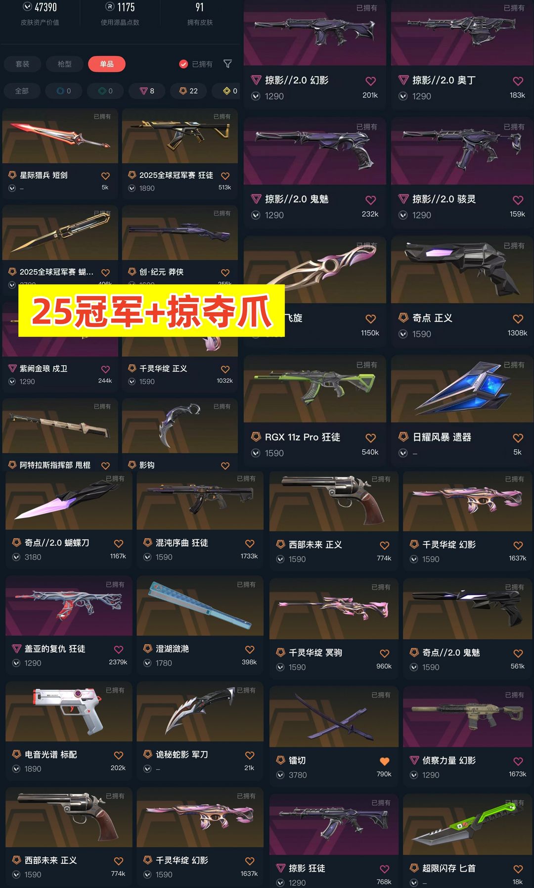 可排✅掠夺爪刀✨25冠军✨显卡2.0✨西部未来✨镭切✨创纪元✨侦查莲花幻影✨混沌盖亚掠夺狂徒✨鱼扇✨