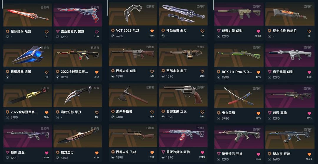 可排✨22冠军套✨西部未来套✨鬼丸国纲✨塑水宗狂徒✨威龙之刃✨VCT爪刀✨堕天狂徒✨离子幻影
