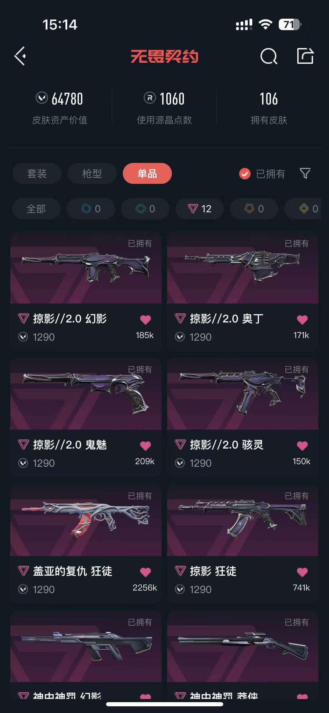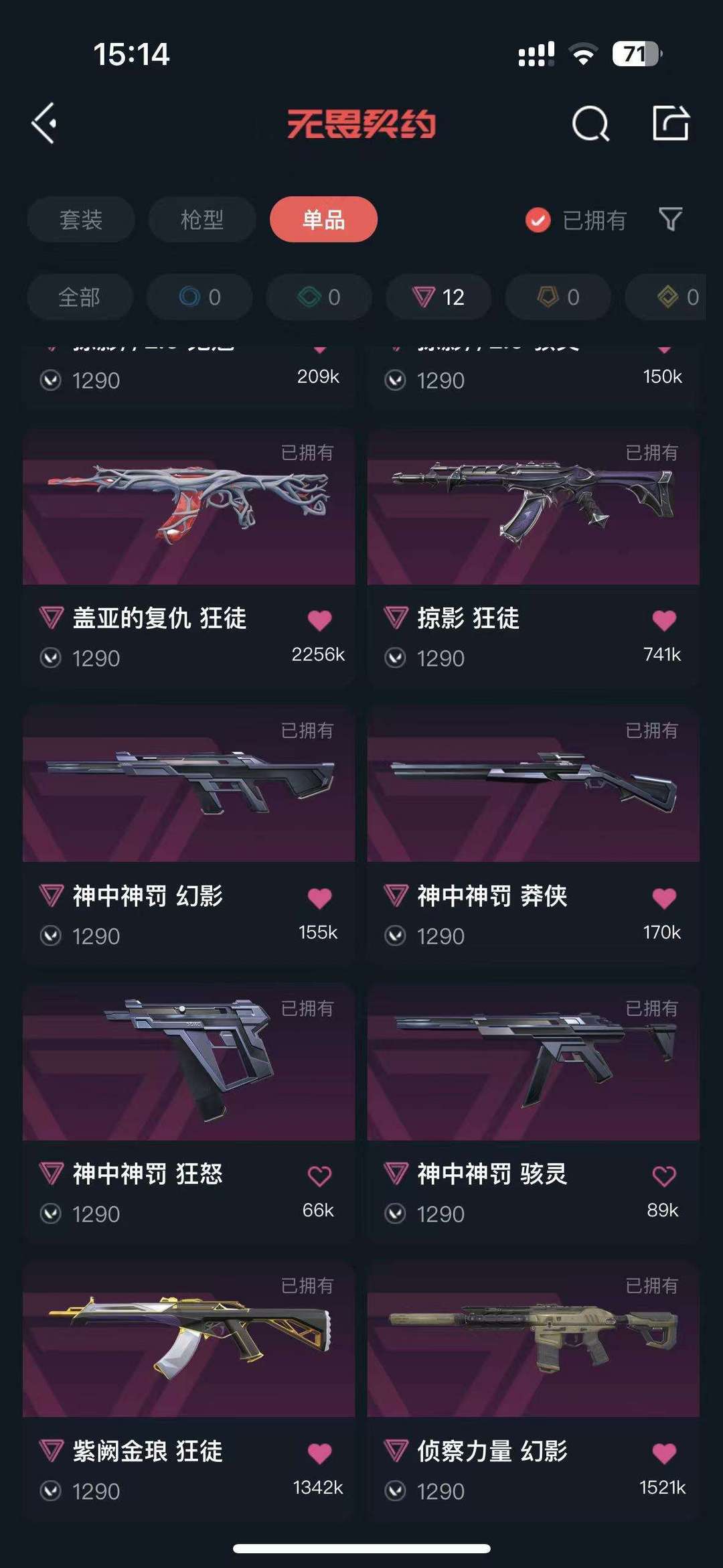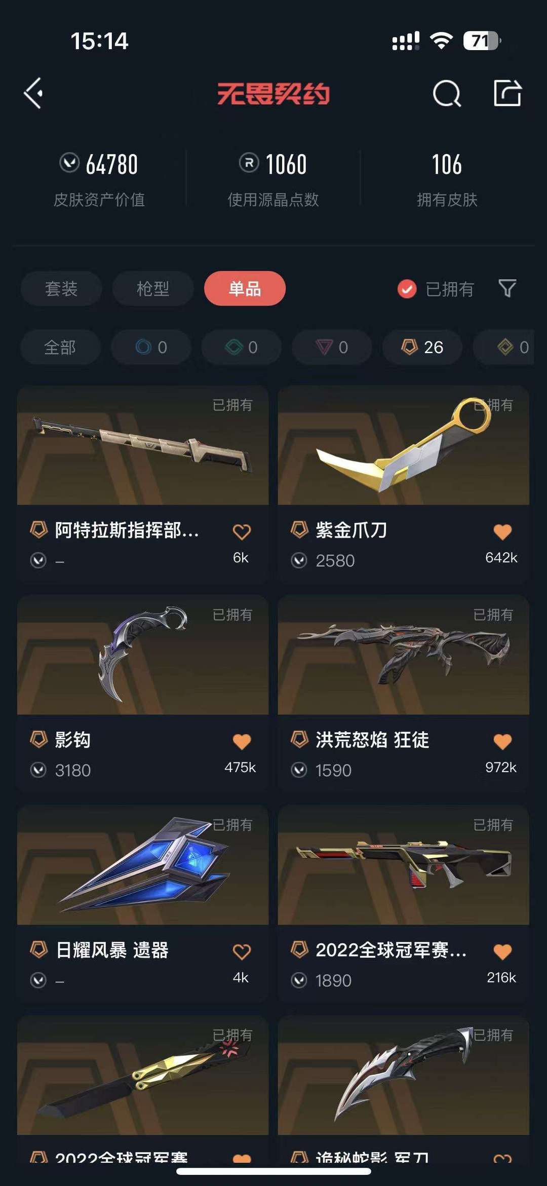 装备描述:VCT爪刀⭐️奇点套⭐️神之刃神罚套⭐️22冠军套⭐️掠影2.0套⭐️影钩⭐️EDG标配⭐️穿花蝴蝶⭐️夜刃诡镰⭐️盖亚AK⭐️混沌AK⭐️塑水宗AK⭐️紫金AK⭐️掠影A⭐️紫金爪⭐️侦查力量幻影⭐️
