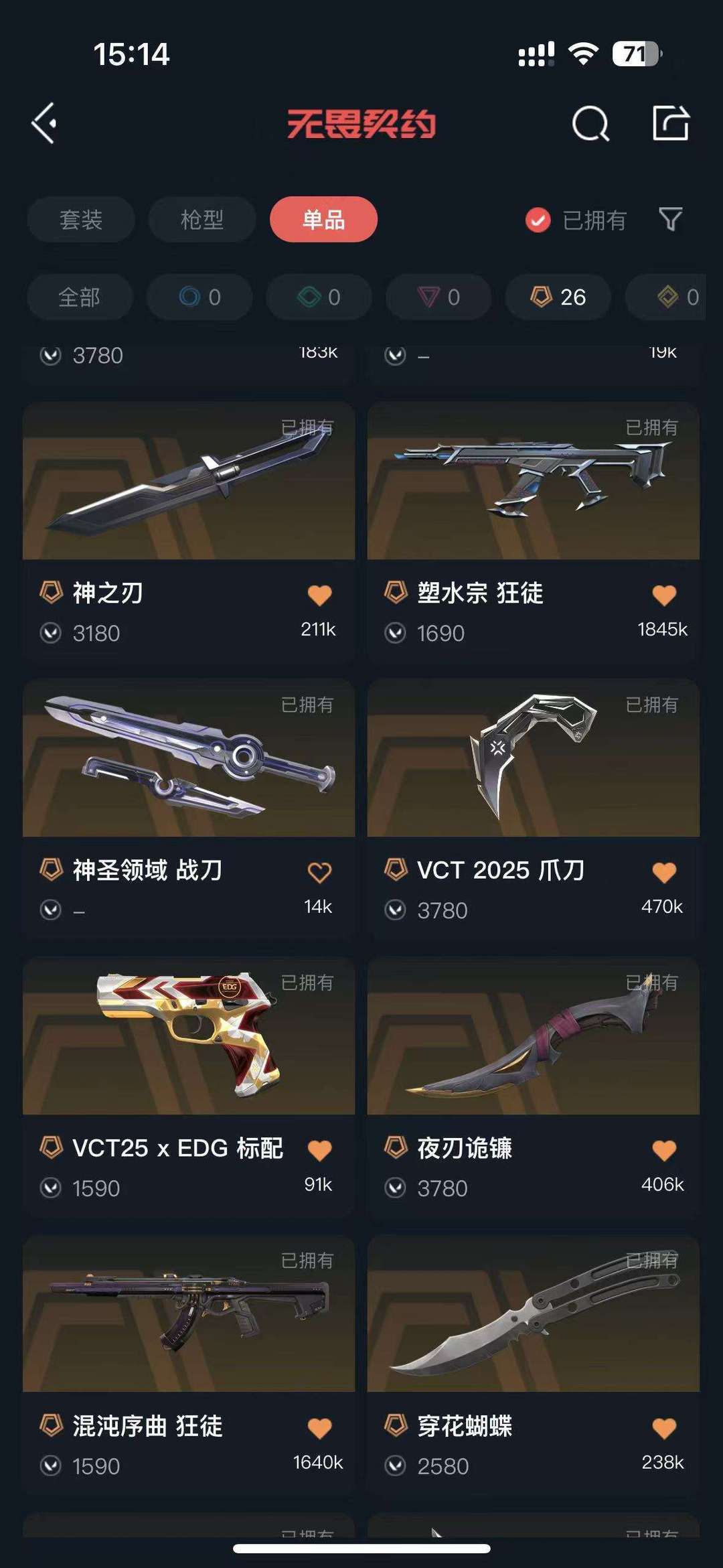 VCT爪奇点套神之刃神罚套22冠军套掠影2套影钩EDG标配穿花蝴蝶夜刃诡镰盖亚AK混沌AK塑水宗AK