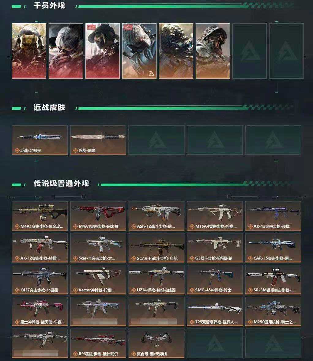 装备描述:【干员皮肤】红狼蚀金玫瑰,骇爪水墨云图,无名夜鹰,红狼电锯惊魂,露娜金牌射手;【近战武器】近战武器-信条,近战武器-黑鹰;【步枪皮肤】SCAR-H战斗步枪-电玩高手,M4A1突击步枪-蚀金玫瑰,M4A1突击步枪-阿米娅,ASh-12战斗步枪-鹅鸭杀,SG552突击步枪-运动员,AK-12突击步枪-夜鹰,AK-12突击步枪-特斯拉线圈,SCAR-H战斗步枪-水墨云图,SCAR-H战斗步枪-启航,CAR-15突击步枪-阿米娅,腾龙突击步枪-捞点薯条,KC17突击步枪-电锯惊魂,AKM突击步枪-林中猎手,QBZ95-1突击步枪-曙光,ASh-12战斗步枪-守夜人,M7战斗步枪-百步穿杨,SG552突击步枪-尖端治疗,SG552突击步枪-深海恐惧,SCAR-H战斗步枪-囚徒,G3战斗步枪-流沙送葬,ASVal突击步枪-尖端治疗,ASVal突击步枪-百步穿杨;【冲锋枪皮肤】P90冲锋枪-信条,UZI冲锋枪-特斯拉线圈,SMG-45冲锋枪-骑士,SR-3M紧凑突击步枪-特斯拉线圈,勇士冲锋枪-能天使-午夜邮差,QCQ171冲锋枪-鹅鸭杀,MP5冲锋枪-深海恐惧,MP5冲锋枪-战术竞备,Vector