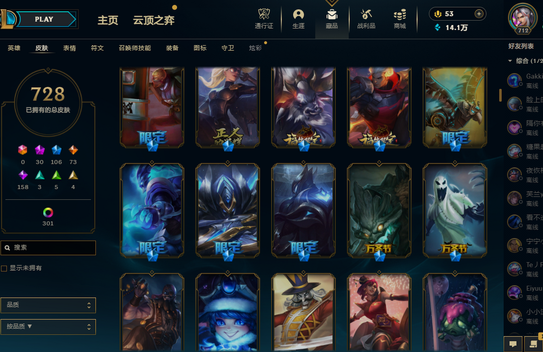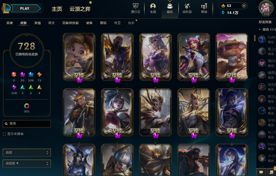 装备描述:70+至臻 源计划套 灰烬铁男 KDA卡莎 斩星剑圣 西部魔影卢锡安 天煞劫