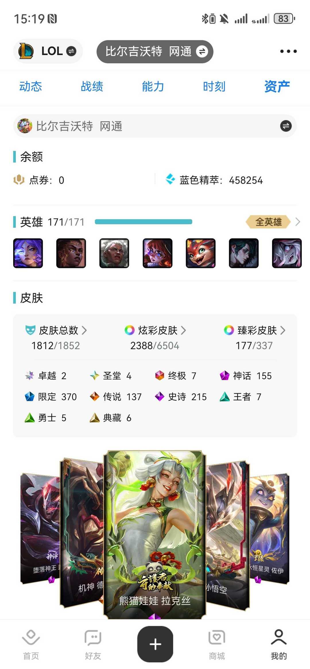 装备描述:7500总皮肤2000原皮肤3000炫彩110臻彩四色龙虾