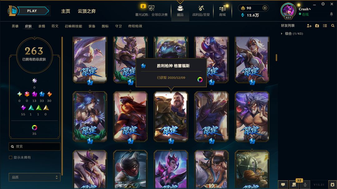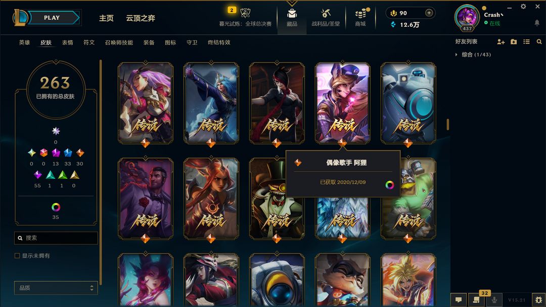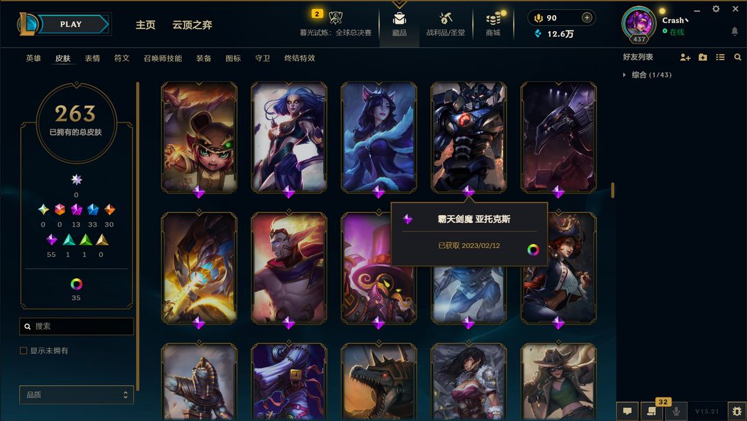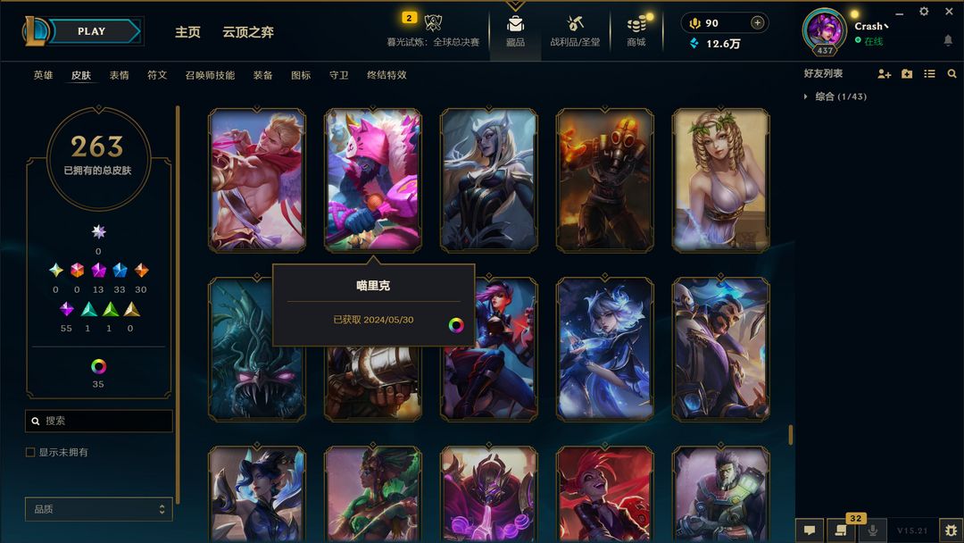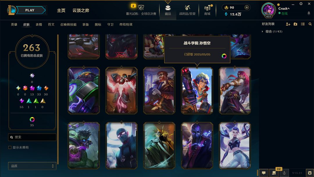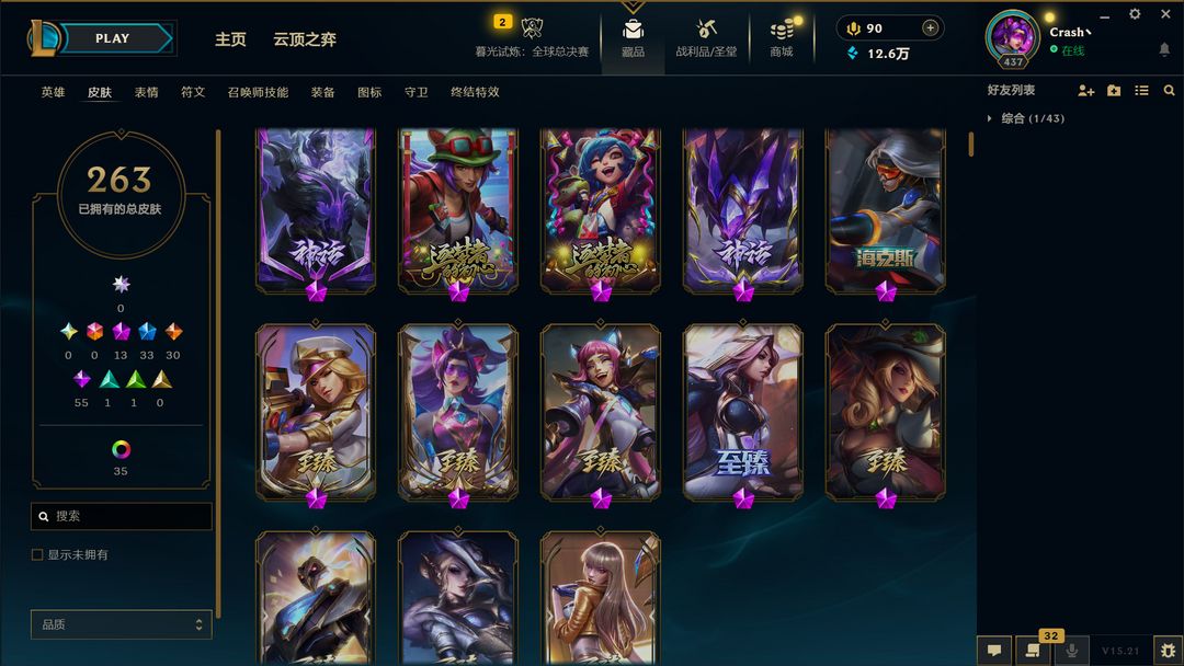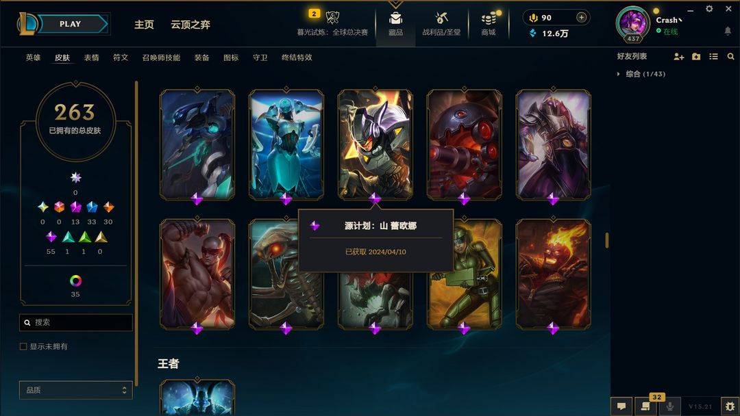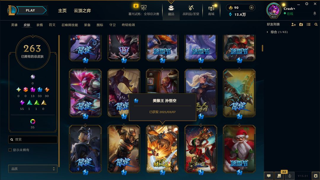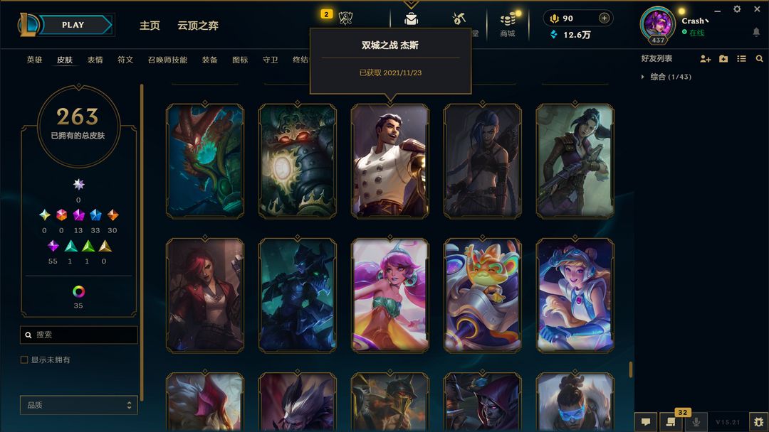 【艾欧尼亚263皮】全英雄单双铂金可排位,有至臻寡妇,金克斯,女枪,低价出租