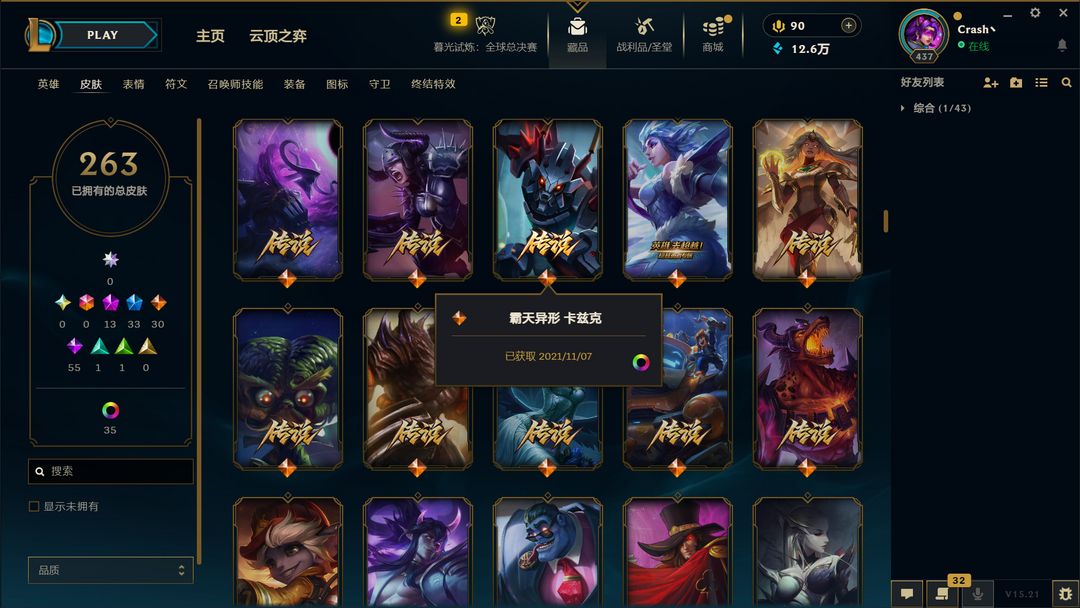 装备描述:【艾欧尼亚263皮】全英雄单双铂金可排位,有至臻寡妇,金克斯,女枪,低价出租