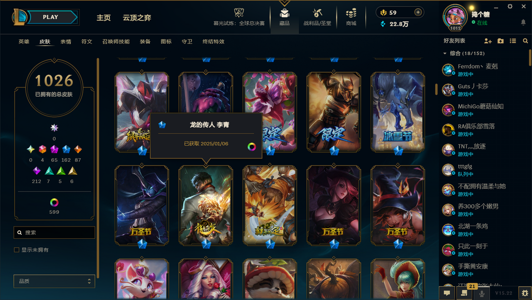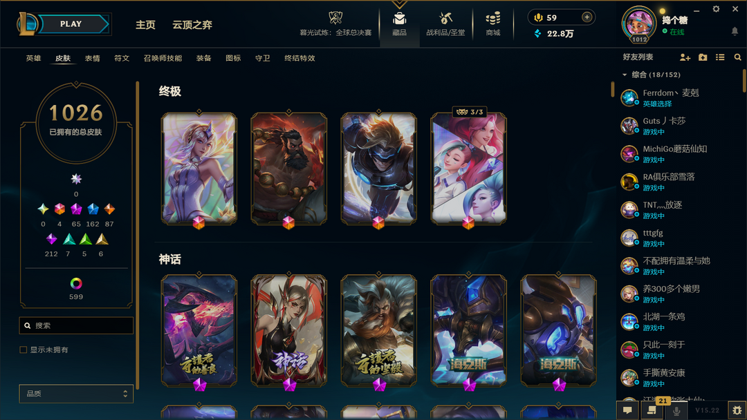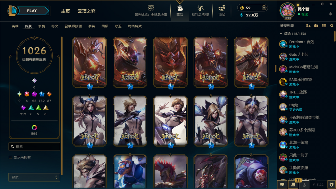 1006原皮,586炫彩,65神话,21臻彩,至臻kda一套,冠军fpx和ig一套,臻彩灵魂莲华一套