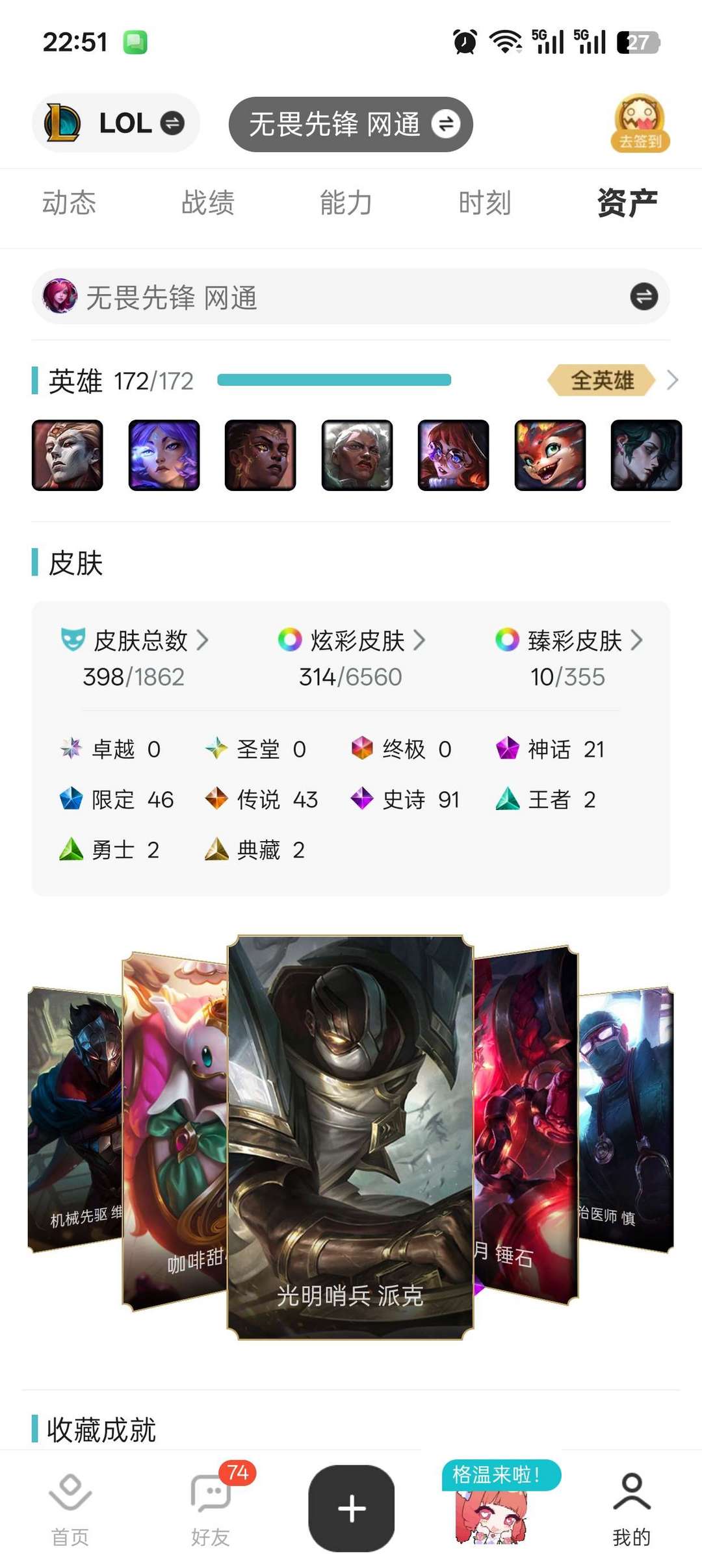 398个原皮,300+炫彩,10臻彩,21神话皮,43传说皮