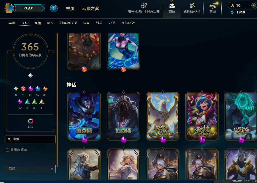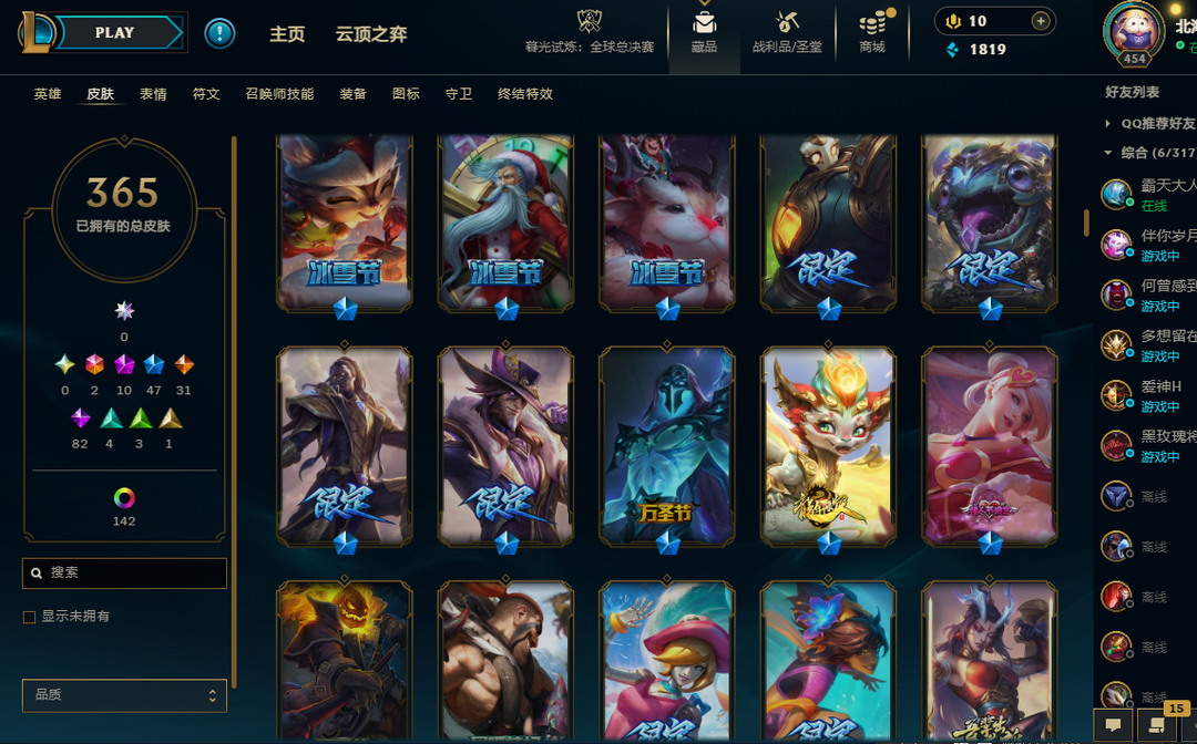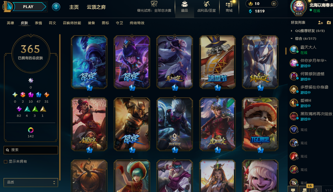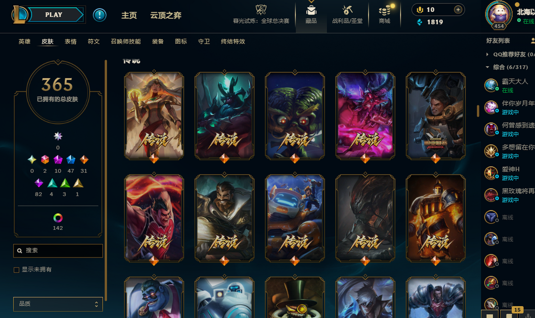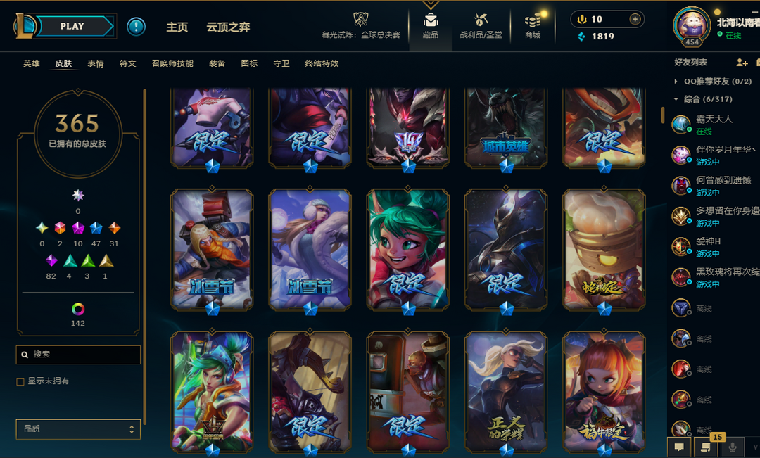 装备描述:账号上主流的皮肤都有,不要挂机就好了.奶妈和琴女的皮肤有点多,也适合女生玩的。电玩勇者瑞文/至臻刀妹/黑夜亚索上单皮肤多点。冷门的英雄皮肤会少点