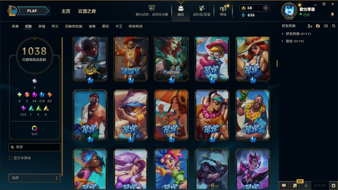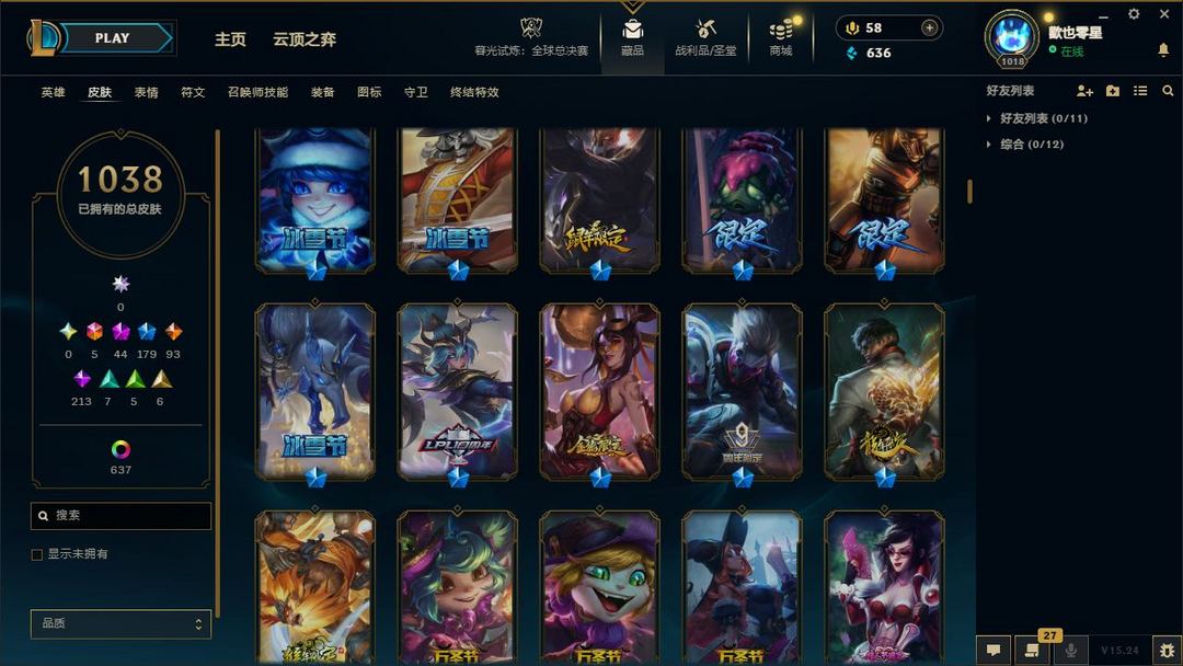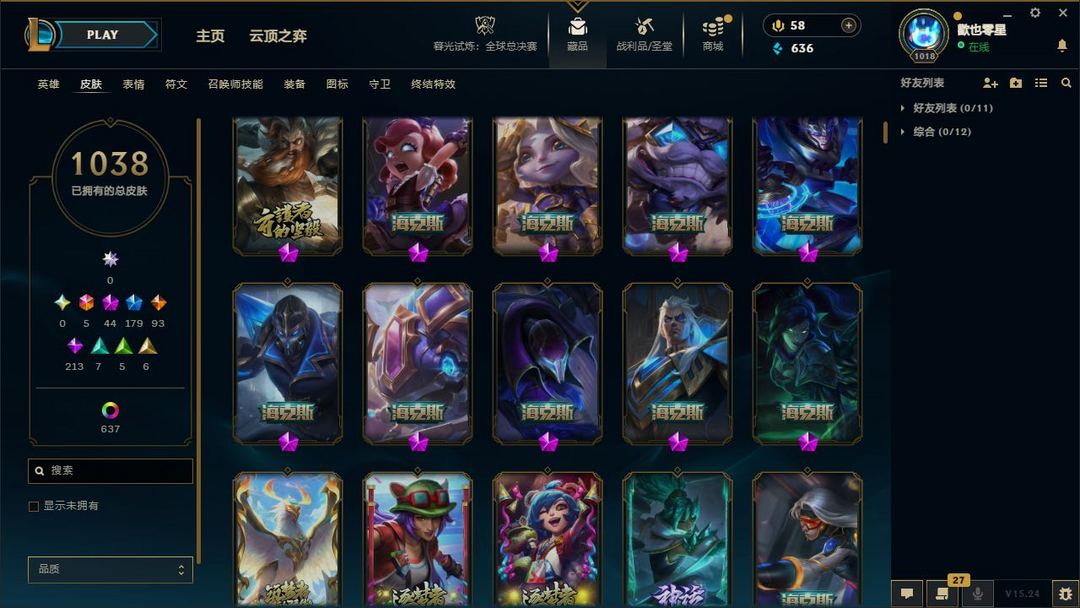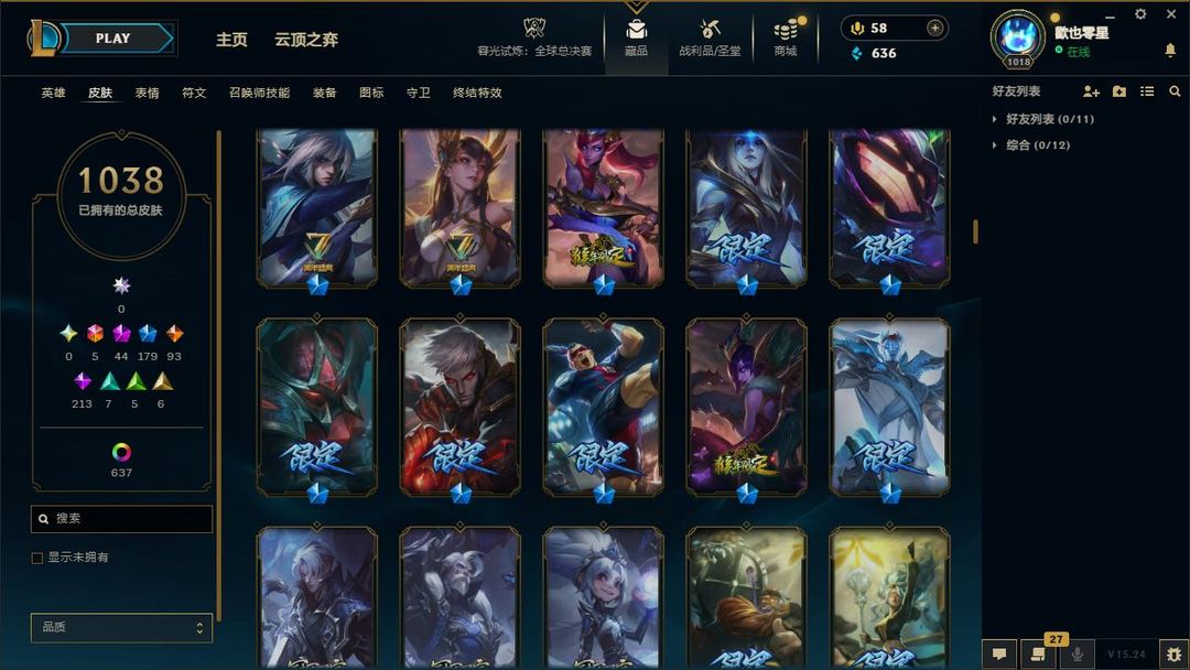 【LOL大王】1700P乄1038原皮乄668炫彩乄33臻彩乄44神话乄179限定乄龙虾乄玉剑男刀