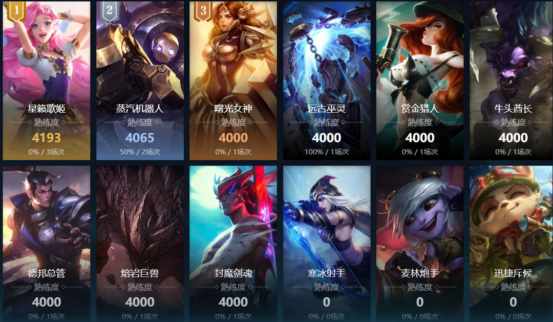 赏金猎人;德邦总管;武器大师;复仇焰魂;光辉女郎;黑暗之女;远古恐惧;无极剑圣;牛头酋长;亡灵战神;