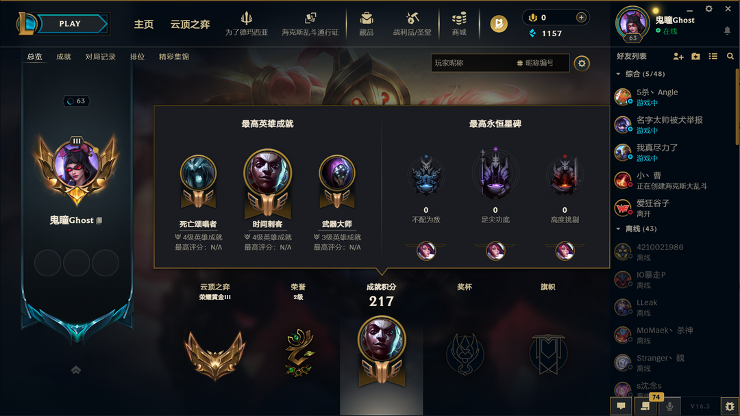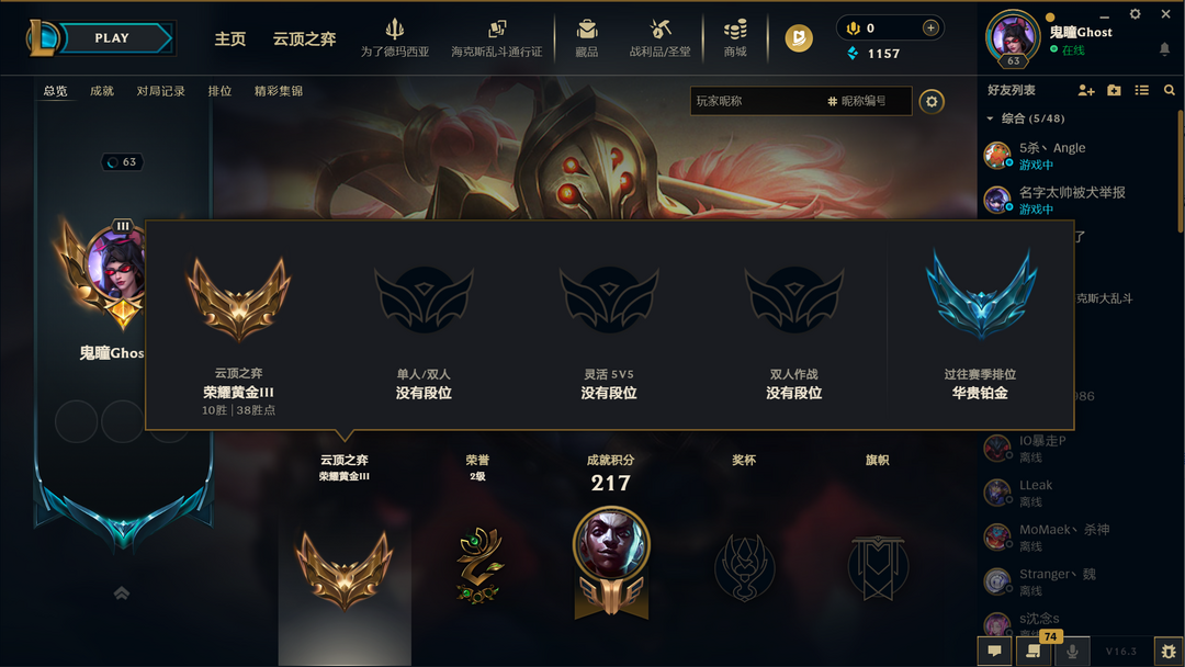 段位:63级 当前赛季无级 当前赛季无