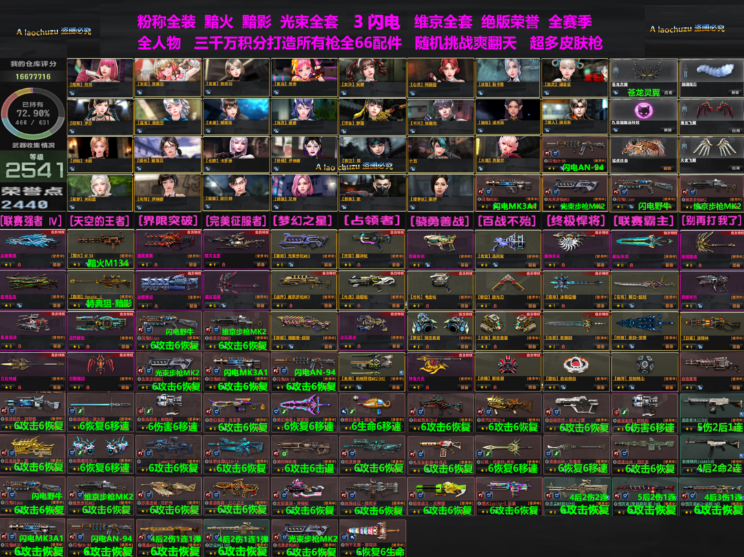 限制: 撤单率<30%才可租用此帐号装备描述:电一粉称,黯火、特典狙-黯影、闪电MG36、闪电MK3A1、野牛、94。光束步枪123,维京步枪全套。2500级。荣誉点2380点,很多绝版荣誉。全赛季。两千万积分打造顶级配件超多皮肤枪。 A佬出租欢迎你的光临!喜欢请收藏店铺,店铺里下单可领红包。 【已去黑雾,画面优化,画质清晰。【欢迎收藏】