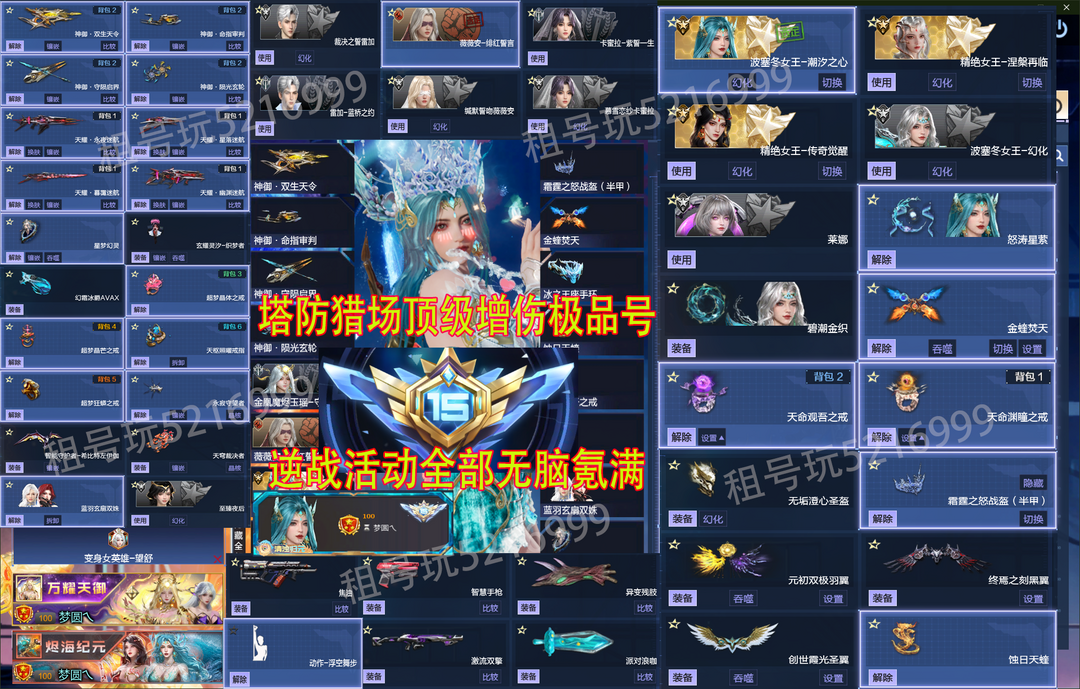 限制: 撤单率<40%才可租用此帐号装备描述:塔防猎场活动拉满〖安全模式可帮解除,点上号器的连系号主发安全码 等待会即可〗秘境965满配基础,风+冰神武45满星 | 秘境满基础增伤| 45星神武 ,双再生芯片一直飞】新道具全氪满【✅新增道具描述✅】:【涅槃女王+波塞冬女王-潮夕之心,冰火金蝰翼,全套配件,传奇三女王】〖返利拉满10+10神谕套全核心,元初双极羽翼,天命渊瞳戒,波塞冬女王-幻化〗虎鲨-回廊界域 | 崩解者-方圜阵丨黑沼-重楼流光丨〖莱娜 | 天命观吾之戒〗【变身英雄望舒+璃璎丨全息搭建枪+焦油】影戍-玄械丨焚霄-玄烬、四臂铠【塔防新伴生灵:冰灵+霜精,蓝雨玄扇双姝,无垢澄心圣盔,智慧手枪,异变残肢】不灭焰甲改+战甲转换器〖光影礼颂婚纱六个角色拉满钢管舞角色〗冰雪皇冠霜霆之怒战盔丨永夜迷航天耀全套皮肤带玄耀灵汐-织梦者皮肤【涅槃幻化,涅槃再临,蚀日天蝰,蛇灵霞帔,永寂守护者】,英雄焚霄,璃鸢-金翎,强盾-圣誓,至臻夜后加超核帝冕✨五蜉灵天耀全套满配✨涅槃女王幻化✨超梦晶体戒✨超梦晶芒戒指全✨大魔导-艳后,掘金-赛特,璃鸢,英雄龙曦新皮肤-凌霜-绫羽拉满,双鳄升级铁血暴君丨侠影锋棱丨新守护天穹裁决者丨〗天枢照耀戒丨