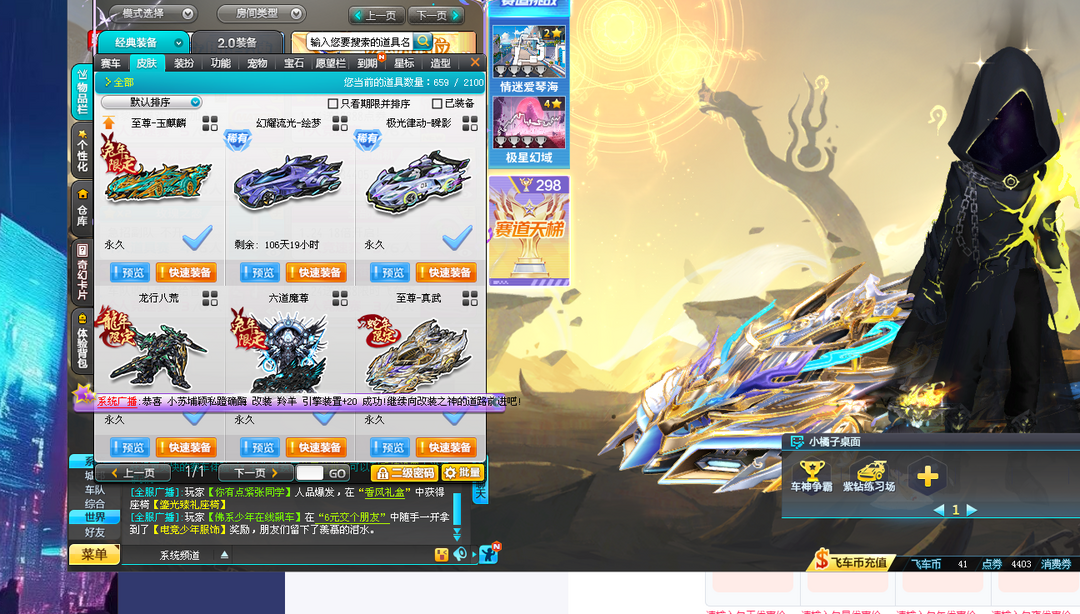 装备描述:顶级227蛇车,玉麒麟,爆天雷洛都有,最帅T3六道魔尊也有顶级宠物强化加10宝石全4级