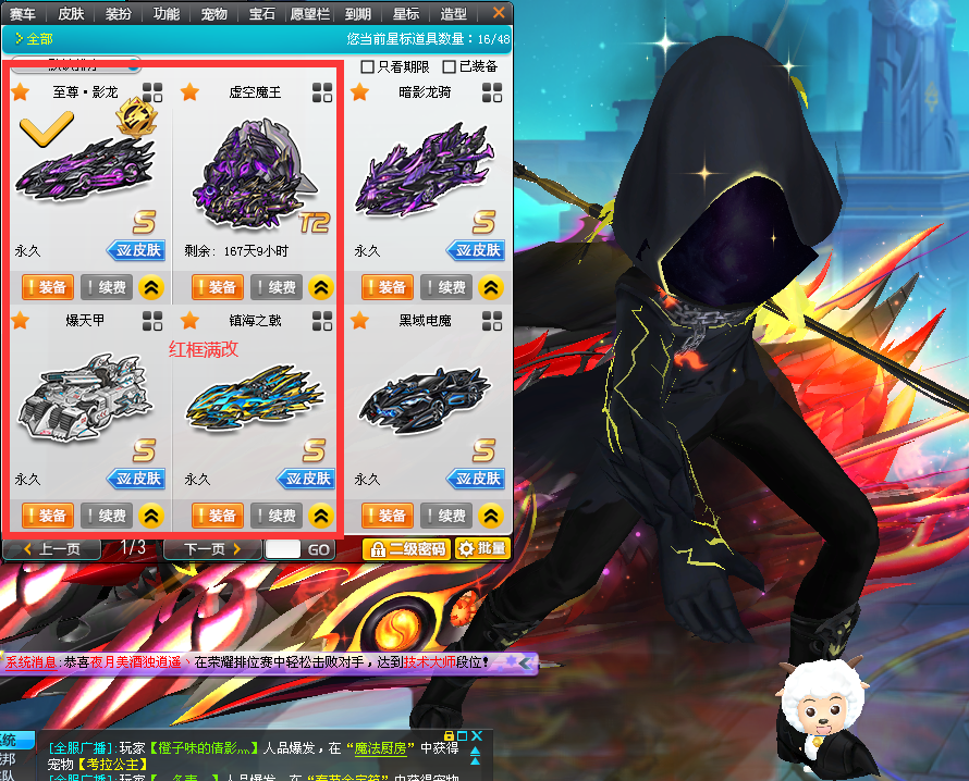 装备描述:套装:死神套,其他自发。 车辆以下均满改: 至尊烛龙=十阶曜影=镇海敖丙=双40雷诺=魔王雷诺=剃刀=高压=神农架