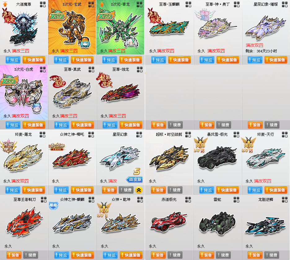 限制: 撤单率<70%才可租用此帐号装备描述:〓S〓15辆〓至尊玄冥-真武、至尊影龙-X次元青龙/烛龙、至尊火麒麟-玉麒麟、至曜影虎-X次元白虎、至尊爆天甲-神奥丁、终极麦凯伦-天行4阶/屠龙、暴风雪-极光4阶/Remake、众神之神-乾坤1阶/哪吒/麒麟 〓T3〓1辆〓六道神尊-六道魔尊 〓T2〓1辆〓光明骑士 〓A〓30辆〓魔王雷诺、雷诺-弑神7阶/幻夜6阶、奔雷圣卫、飞剑太白、裁决者 〓C〓飞碟 〓骑宠〓7只〓双生幽狼+10 〓其他〓13W魅力、1200W荣誉、紫钻7、皇族7 〓女〓70页套装〓 〓男〓50页套装〓