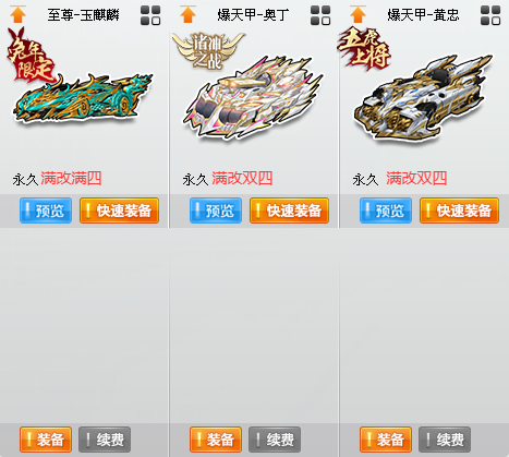 限制: 撤单率<70%才可租用此帐号装备描述:〓S〓2辆〓至尊火麒麟-玉麒麟、爆天甲-奥丁/黄忠 〓A〓10辆〓 〓骑宠〓1只〓雪凝公主+10 〓其他〓1W魅力、300W荣誉、紫钻5 〓女〓30页套装〓 〓男〓30页套装〓