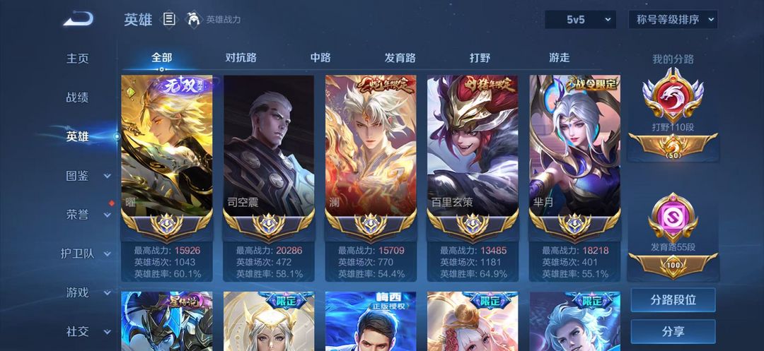 正式服在榜110段打野⭐2w分司空震五国服⭐2w分宫本武藏⭐v10超多省级限定皮肤⭐可排位