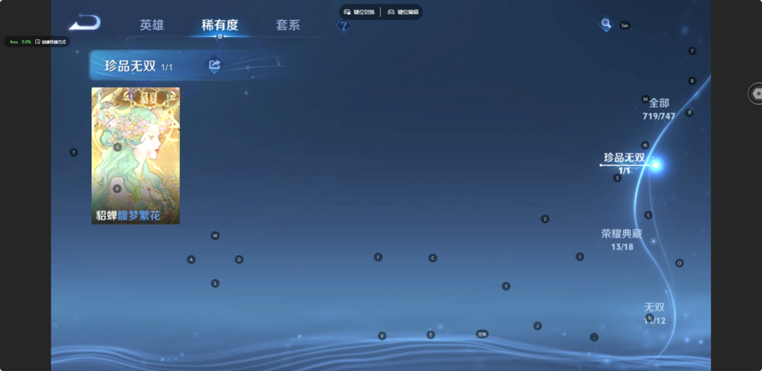 荣耀V10⚡719皮⚡13典藏⚡11无双⚡1珍品无双⚡6珍品⚡128传说⚡馥梦繁花⚡拾光映像