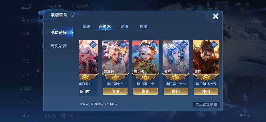 85段对抗路五省标。貂蝉影 姬小满 夏洛特曹操 海诺有巅峰框 历史小国海诺花木兰姬小满曹操亚瑟刘禅