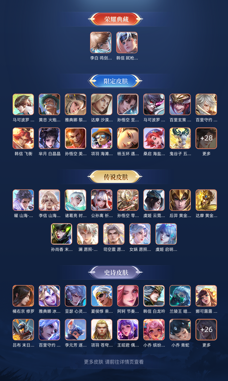 装备描述:英雄:韩信(韩信 弑枪猎影,韩信 白龙吟,韩信 傲雪梅枪,韩信 飞衡,韩信 街头霸王,韩信 教廷特使,区标);马可波罗(马可波罗 山海·玄木吟,马可波罗 暗影游猎,马可波罗 激情绿茵);刘禅(刘禅 绅士熊喵,刘禅 英喵野望,刘禅 唤灵魔甲,刘禅 秘密基地,刘禅 天才门将,刘禅 鸭鸭历险记,区标);曜(曜 山海·苍雷引,曜 归虚梦演);澜(澜 愿照·九州拓,澜 孤猎);干将莫邪(干将莫邪 久胜战神,干将莫邪 第七人偶);孙策(孙策 百相守梦,孙策 乘龙·淬吴钩,孙策 猫狗日记);虞姬(虞姬 夏日便利店,虞姬 启明星使,虞姬 云霓雀翎,虞姬 加勒比小姐,虞姬 凯尔特女王);狄仁杰(狄仁杰 绮世丹青,狄仁杰 锦衣卫,狄仁杰 万华元夜,狄仁杰 魔术师,狄仁杰 鹰眼统帅,狄仁杰 阴阳师);项羽(项羽 苍威无极,项羽 帝国元帅,项羽 苍穹之光,项羽 科学大爆炸,项羽 海滩派对);女娲(女娲 万灵启世,女娲 尼罗河女神,女娲 愿照·千秋盛);海月(海月 幻泉雾影);孙尚香(孙尚香 乘龙·问璇玑,孙尚香 沉稳之力,孙尚香 蔷薇恋人,孙尚香 末日机甲,孙尚香 水果甜心);百里守约(百里守约 特工魅影,百