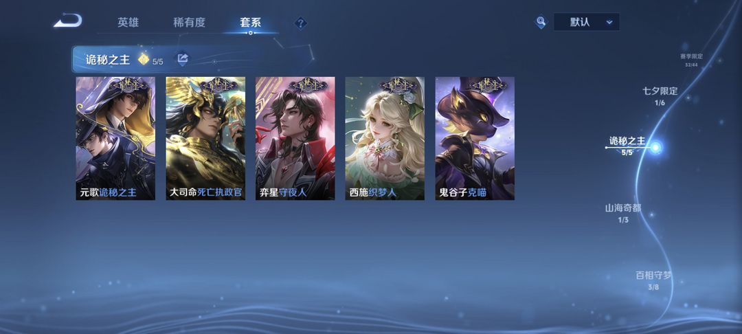 装备描述:英雄:莱西奥(莱西奥 光弋星穹,莱西奥 踏浪烽翎,莱西奥 西部游侠);澜(澜 逐花归海,澜 孤猎);后羿(后羿 神树通天,后羿 如梦令,后羿 完美运算,后羿 阿尔法小队,后羿 精灵王);安琪拉(安琪拉 乘龙·聚宝船,安琪拉 玩偶对对碰);阿轲(阿轲 节奏热浪,阿轲 致命风华);艾琳(艾琳 鹤鸣心笺,艾琳 女武神);孙悟空(孙悟空 孙行者,孙悟空 西部大镖客);百里守约(百里守约 雪豹·霜爪,百里守约 特工魅影,百里守约 绝影神枪);苍(苍 维京掠夺者);伽罗(伽罗 箭羽风息,伽罗 琥珀纪元,伽罗 花见巫女);铠(铠 曙光守护者,铠 龙域领主);夏洛特(夏洛特 永昼);廉颇(廉颇 功夫炙烤,廉颇 地狱岩魂);张良(张良 罗小黑战记,张良 古海寻踪,张良 缤纷绘卷,张良 幽兰居士);花木兰(花木兰 九霄神辉,花木兰 兔女郎);兰陵王(兰陵王 傩神司,兰陵王 暗隐猎兽者,兰陵王 金庭之子,兰陵王 隐刃);诸葛亮(诸葛亮 黄金分割率,诸葛亮 掌控之力,诸葛亮 星航指挥官);元流之子(坦克);王昭君(王昭君 幻想奇妙夜,王昭君 偶像歌手,王昭君 凤凰于飞);钟馗(钟馗 虚灵犬护,钟馗 驱傩正仪,
