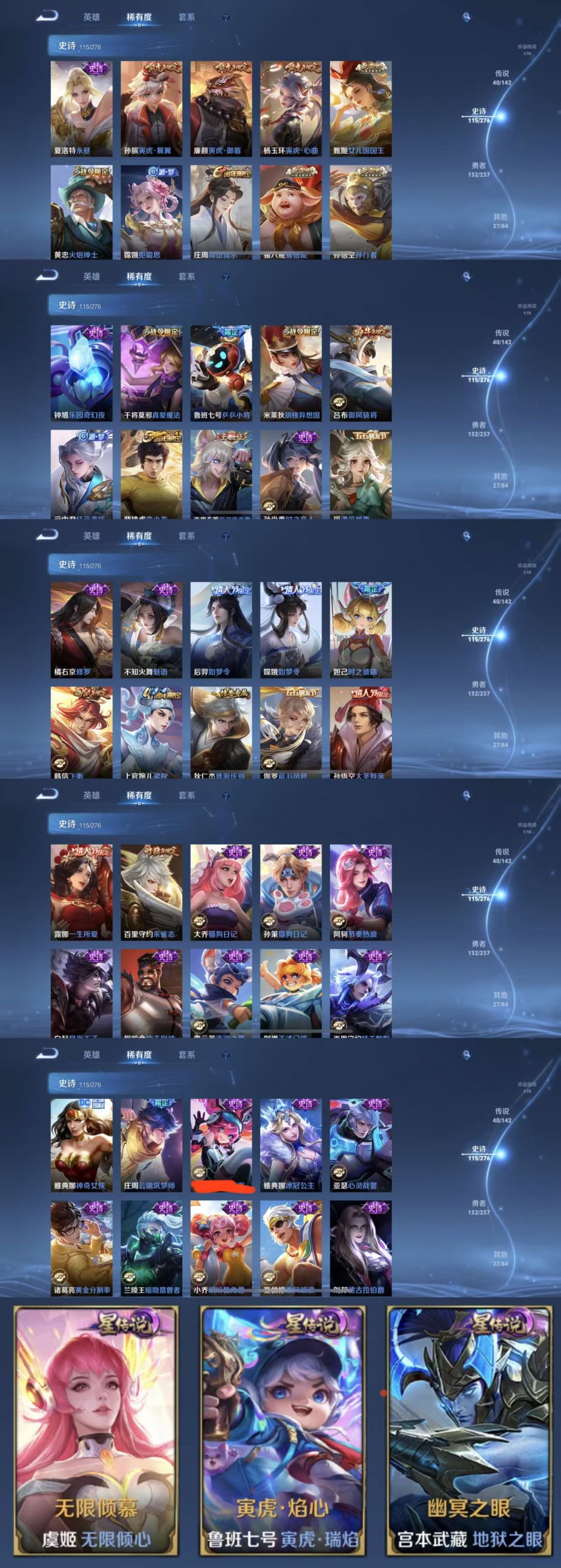 限制: 撤单率<49%才可租用此帐号装备描述:到时间不下拉黑处理永不解除,顶号机器会秒禁玩改密,顶号不仅拉黑还没得玩,赚三两块不容易,请理解谢谢。 ❤❤❤❤❤❤❤❤❤❤❤❤❤❤❤❤❤❤ 请勿开挂,挂机,送头,骂人,撤单后游戏等如有违规永久拉黑永不解除。 重置二级密码不要费劲了,号主每天都会上号查看,多行不义必自毙,人在做天在看,多做好事多自律,少做缺德事。 该号英雄128个皮肤318个,典藏2个,无双1个,珍品传说1个,星传说3个,传说40个,史诗115个,祝您游戏愉快~