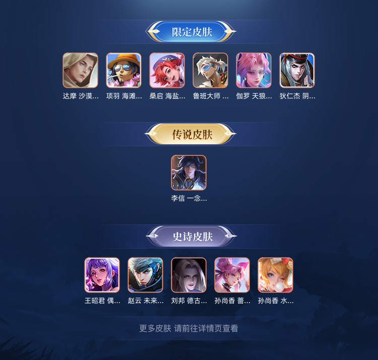 英雄基本都有,有李信一念神魔跟伽罗的皮肤,炸鱼用
