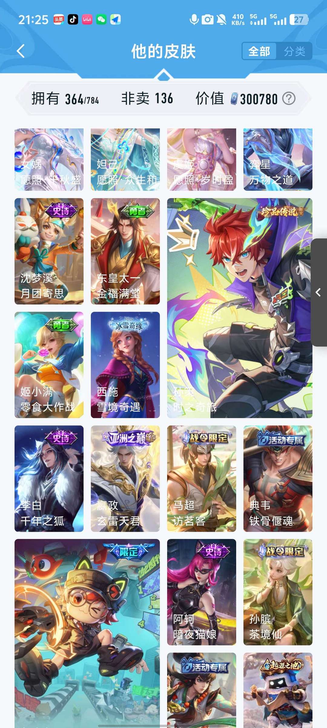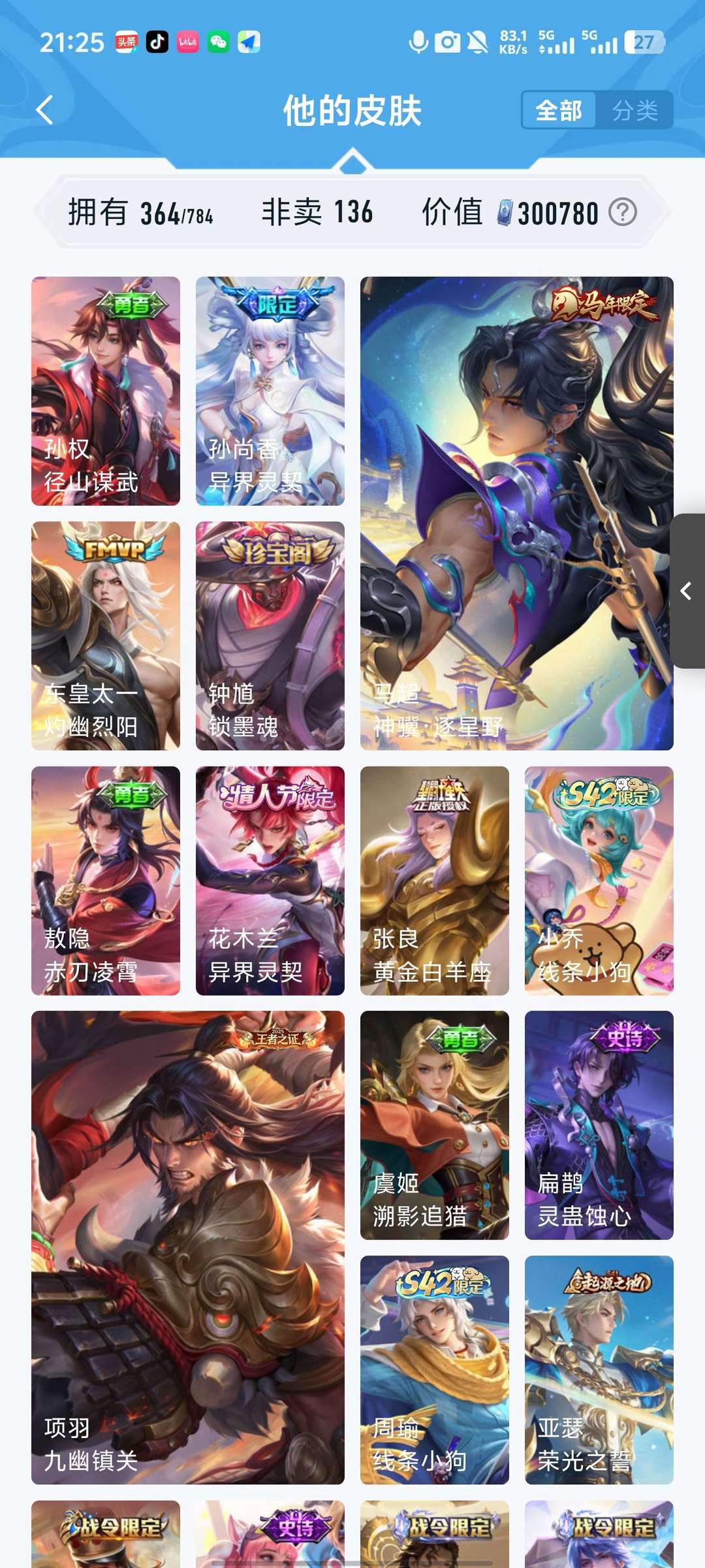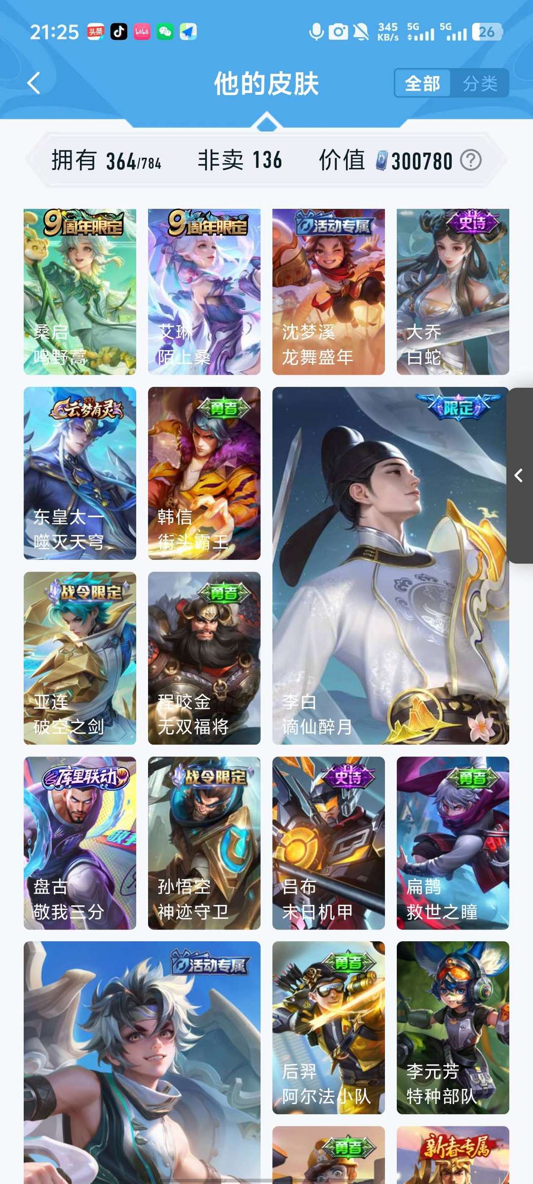 非凡王者,150级铭文,怪盗基德,大耳狗,年限皮肤无双限定,典藏皮肤和小兵,各个皮肤几乎都有