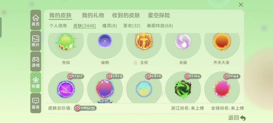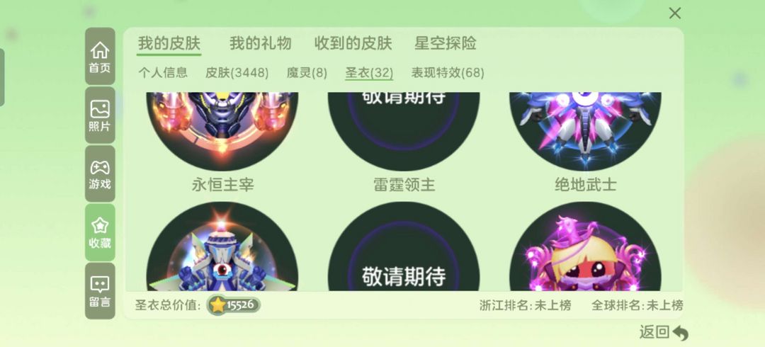 装备描述:魔法屋已开出破晓,三级占卜牌,抹茶水滴都有,有两个敬请期待,逃杀开局30个盾,内吐号,历史十赛季超神,吞噬特效超多
