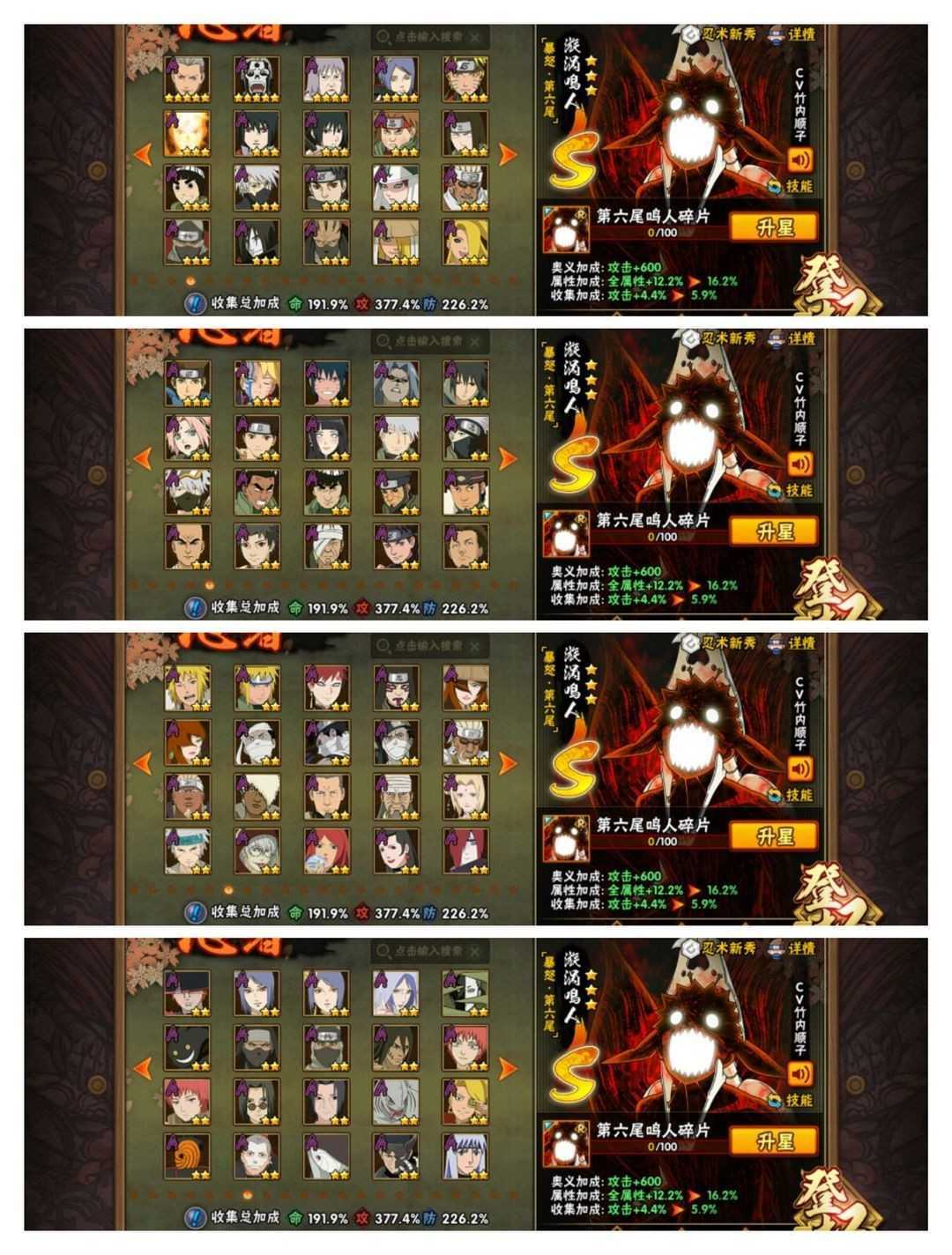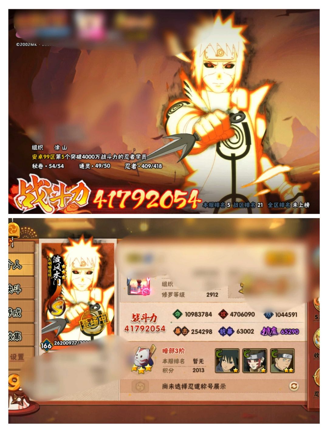 410全忍者☀九喇嘛水门☀4200万顶配☀54S100A☀氪金十万☀六尾鸣人☀66级魅力☀漂泊带土