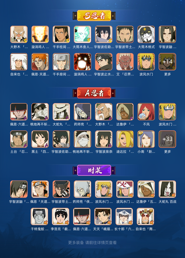 30s,48a,主流氪金忍者和4个主流98通,天道超,飘带,盾构,侠隐佐助,侠影兜10级霸体