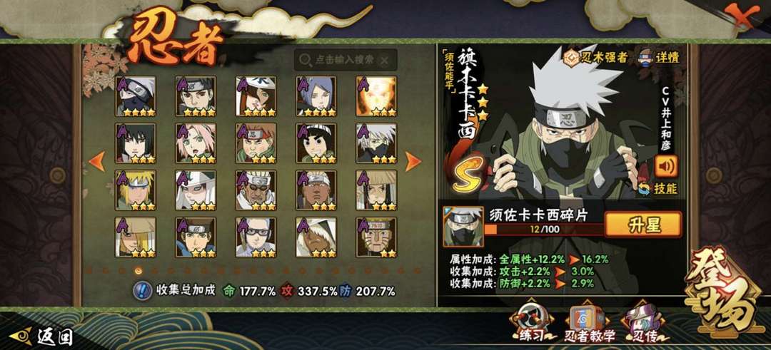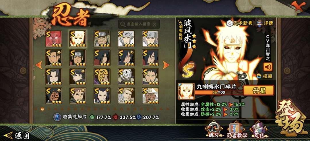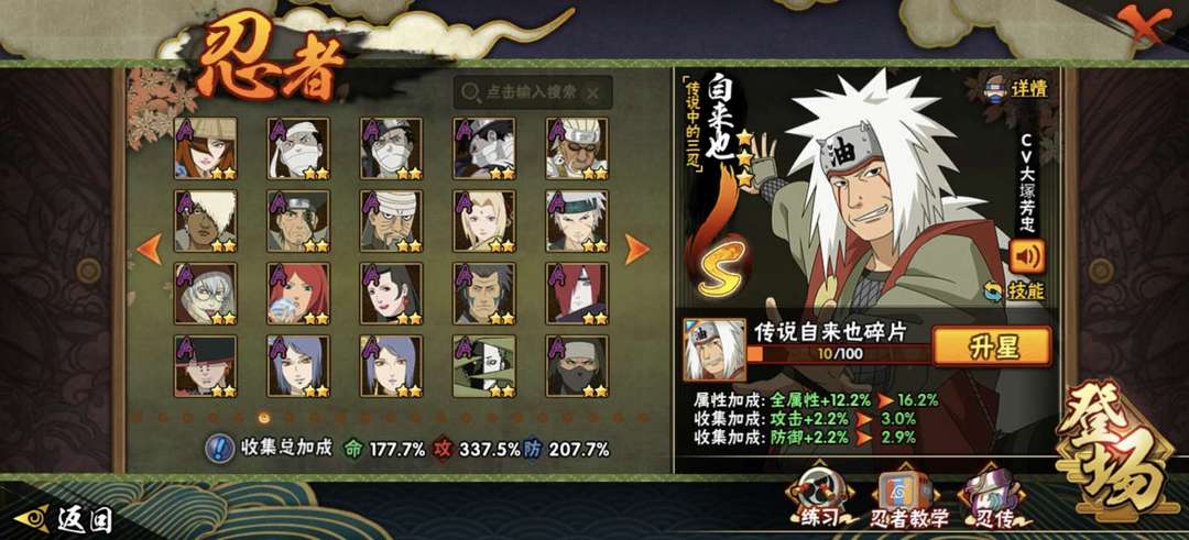 装备描述:V15✨全S忍✨仙人巳月✨金身水门✨传说自来也✨暴怒九尾✨忍战卡卡西✨解斑✨天道超✨白面具✨永恒佐助✨忍战带土