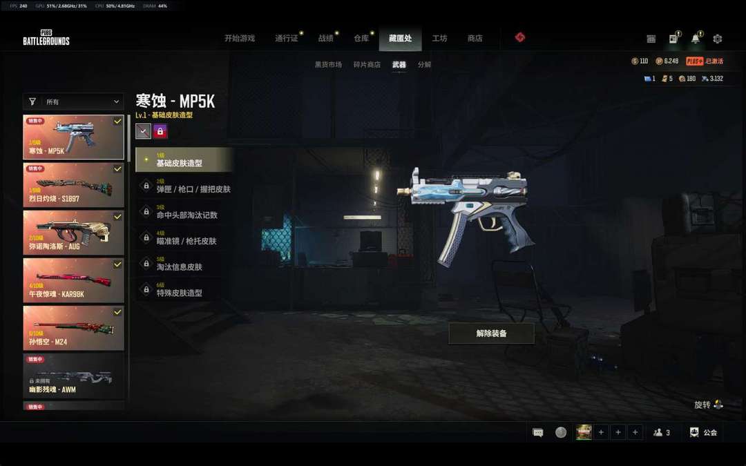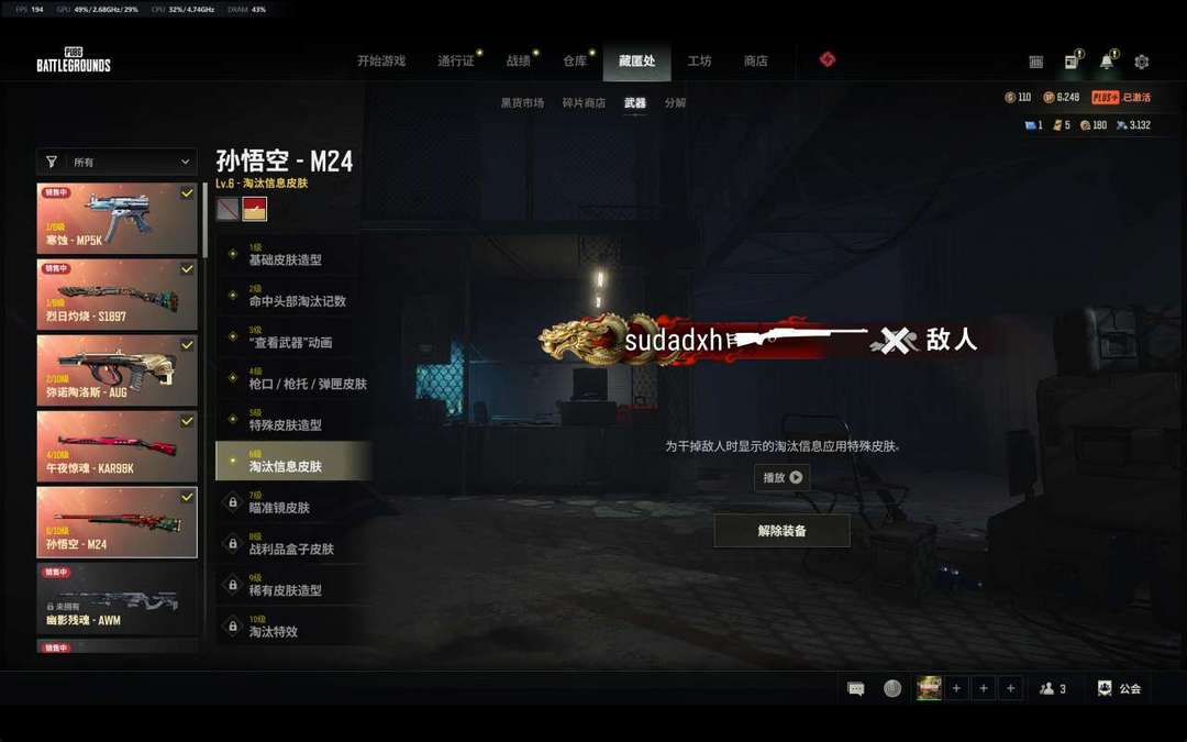 6级m24孙悟空异色,4级98k午夜惊魂,2级弥诺陶洛斯,1级mp5k寒蚀,1级烈日灼烧s1897