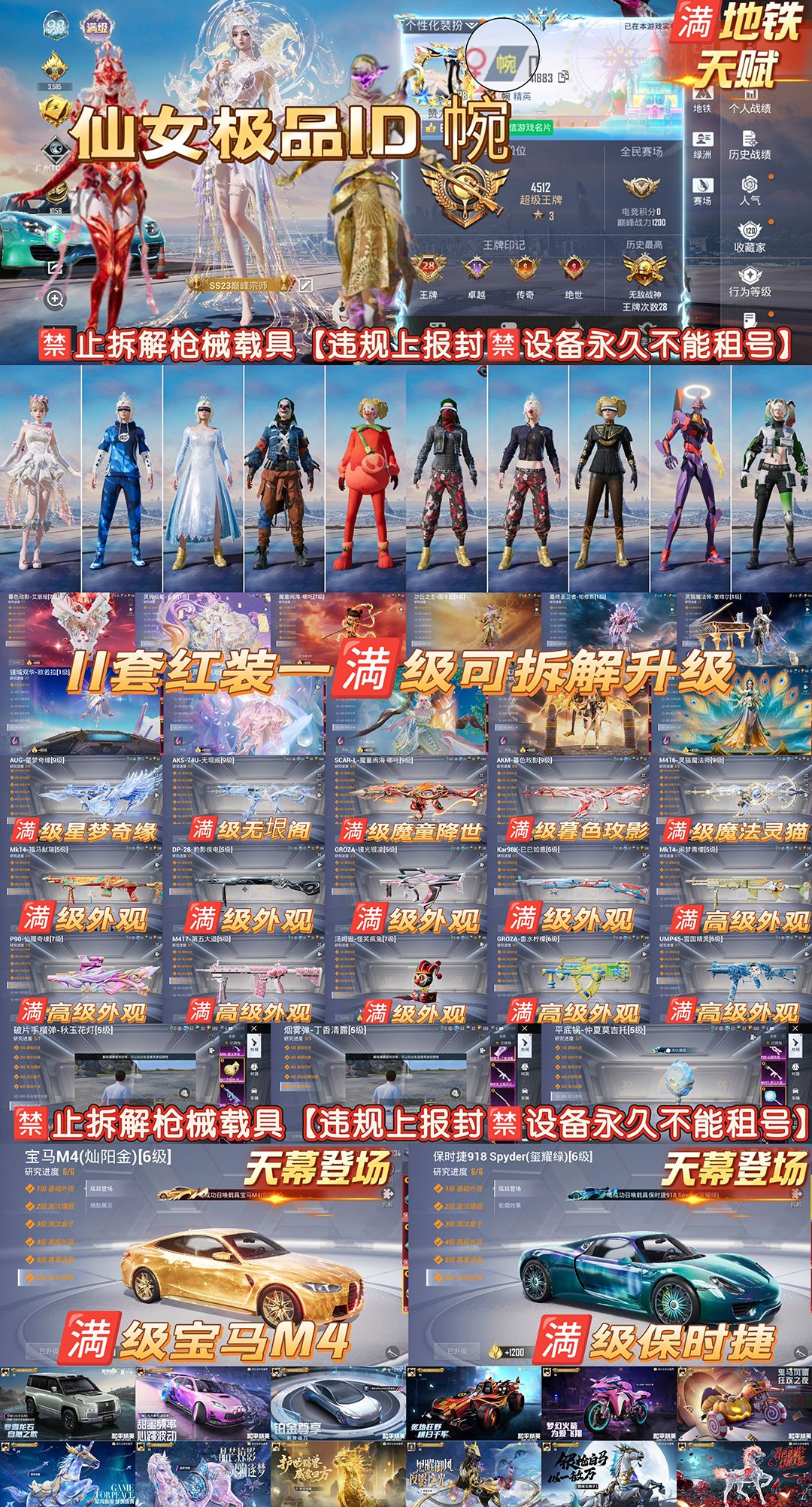 限制: 租号17次及以上 |装备描述:特别声明!!!! 分解载具枪械永久拉黑不解除 【乱投诉拉黑】和平号有问题/上不去/其他问题/ 特殊需求/投诉没用等问题 账号累计充值超40万!切勿开挂/分解装备/恶意骂人/等等违规行为,发现违规必追查到底(平台登录记录,游戏登录ip手机号 设备串号 充值付款记录不要侥幸现在网警都能调到你的所有行为记录就算盗用他人信息也一样能查到你头上)按账号充值金额=起诉/刑事立案/追责赔偿! 非速玩【非云!本机设备畅玩不卡顿】