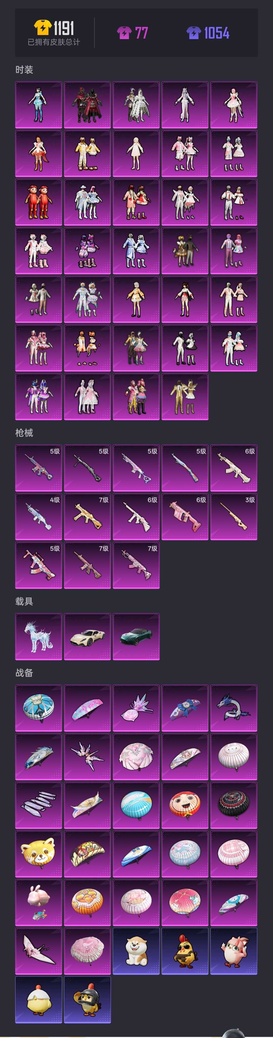 限制: 租号1次及以上 | 撤单率<49%才可租用此帐号装备描述:该号女号噢~ 套装250个,粉色34套。 枪皮288个,特效枪13个。 装备425个,三级头55个,三级包64个 载具皮肤3个 降落伞97个,滑翔尾迹12个,僚机1个,动作107个。 祝您游戏愉快~请勿开挂谢谢宝宝~