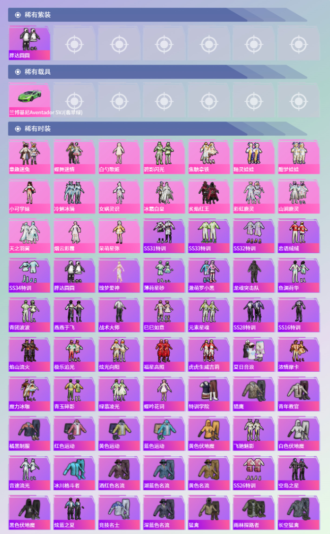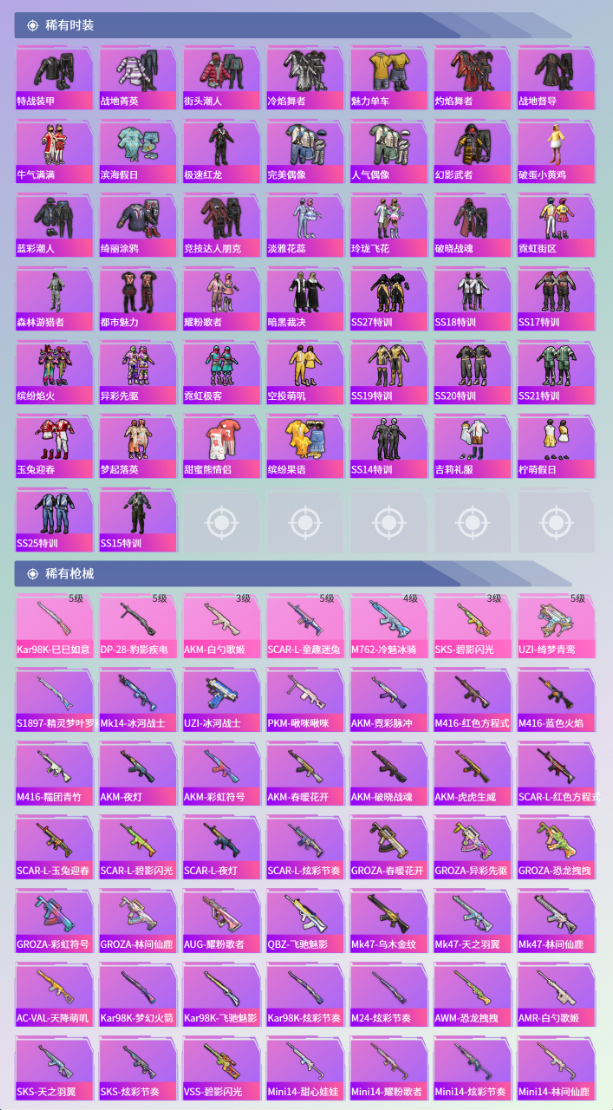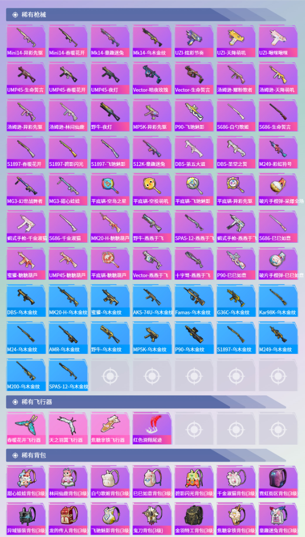 包天特惠素材号⭕17粉装7特效枪1载具4飞行器⭕114套装114枪械