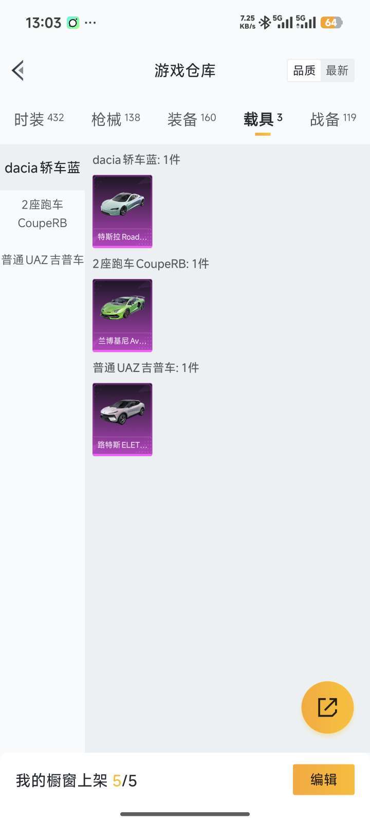 装备描述:路特斯,兰博基尼,特斯拉,scar特效枪,m4特效枪,mg3特效枪,多种飞行器可选择