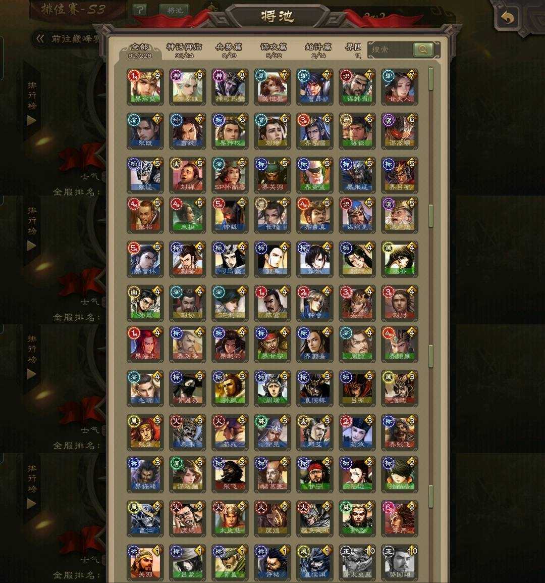 限制: 撤单率<50%才可租用此帐号装备描述:神姜维◆神司马懿◆神赵云神吕布◆界钟会界李儒◆星董卓◆花鬘◆白马