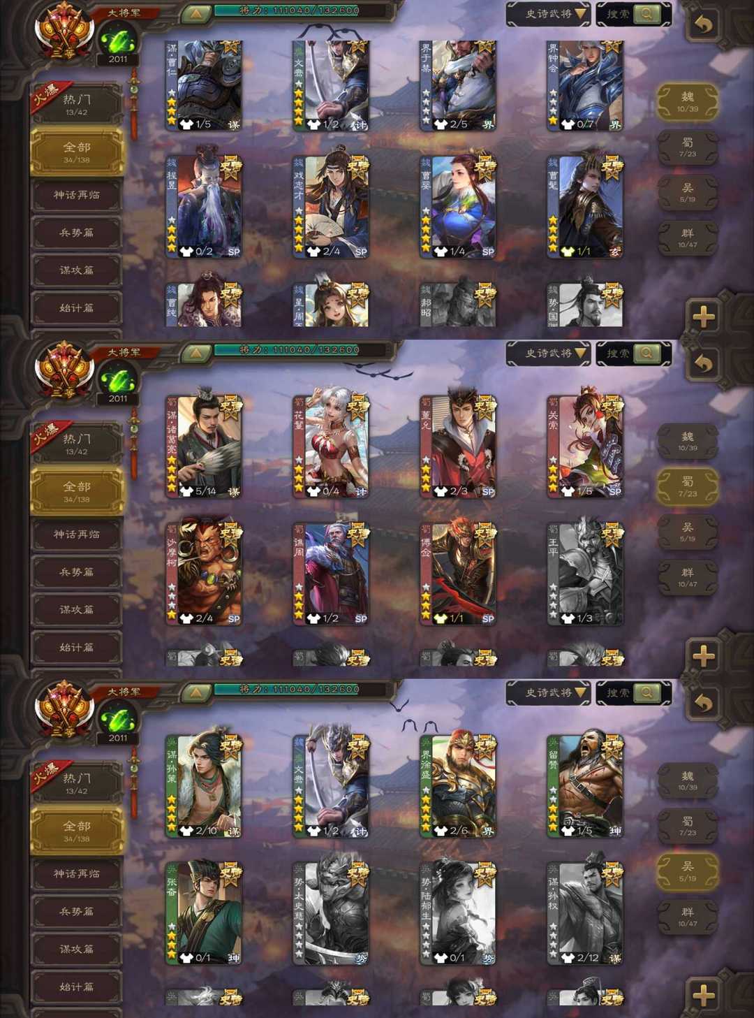 装备描述:大将军枭龙破渊双形态动态曹髦/傲凌绝顶至尊双形态动态谋孙策/金皮神司马懿/动态徐荣/动态文鸯/动态谋诸葛亮/双乌龟谋曹仁傅佥/张奋/裴秀/动态南华老仙/动态界李儒/手办皮曹婴/动态神陆逊等史诗,友徐庶,司马孚,势田丰,势杨弘,孟达等强力精品