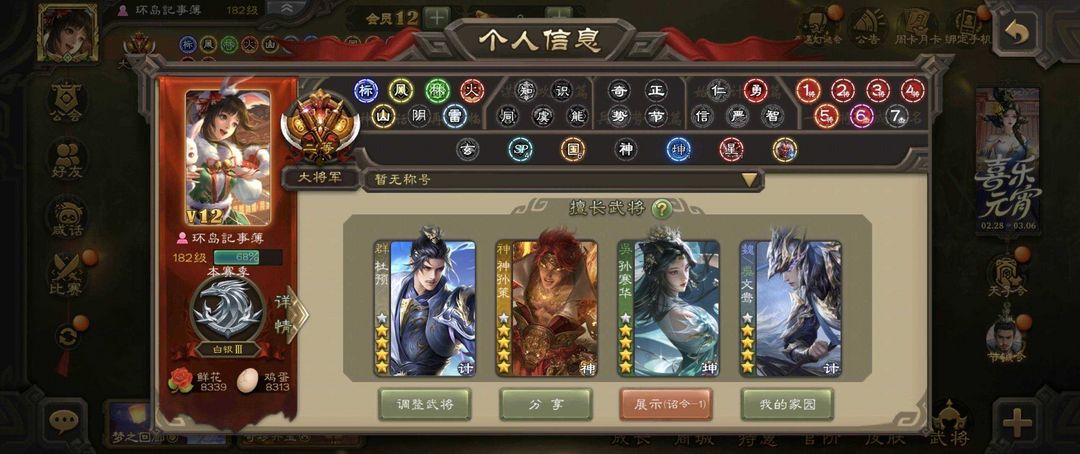 装备描述:二等大将军 VIP:12 武将总数:422 史诗武将:149 动态皮肤:53 魏国武将:⚡郝昭⚡王粲⚡文鸯⚡界于禁⚡界钟会⚡界曹真⚡嵇康⚡程昱⚡戏志才⚡杨修⚡陈琳⚡曹婴⚡SP司马昭⚡司马昭⚡曹纯⚡星周不疑⚡ 蜀国武将:⚡王平⚡诸葛瞻⚡谋马超⚡花鬘⚡张星彩⚡董允⚡赵襄⚡关索⚡沙摩柯⚡谯周⚡ 吴国武将:⚡骆统⚡周处⚡吴景⚡文鸯⚡界徐盛⚡贺齐⚡留赞⚡孙寒华⚡ 群雄武将:⚡左慈⚡谋貂蝉⚡杜预⚡沮授⚡界李儒⚡张让⚡麴义⚡审配⚡卑弥呼⚡苏飞⚡张琪瑛⚡公孙康⚡兀突骨⚡杨彪⚡裴秀⚡司马昭⚡郑玄⚡南华老仙⚡星黄忠⚡ 神将:⚡神赵云⚡神孙策⚡ 排位武将:140 国战武将:42 霸王在世-神孙策 战龙在野-神赵云