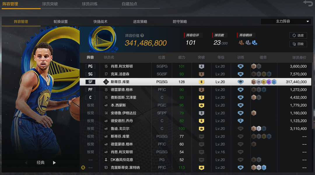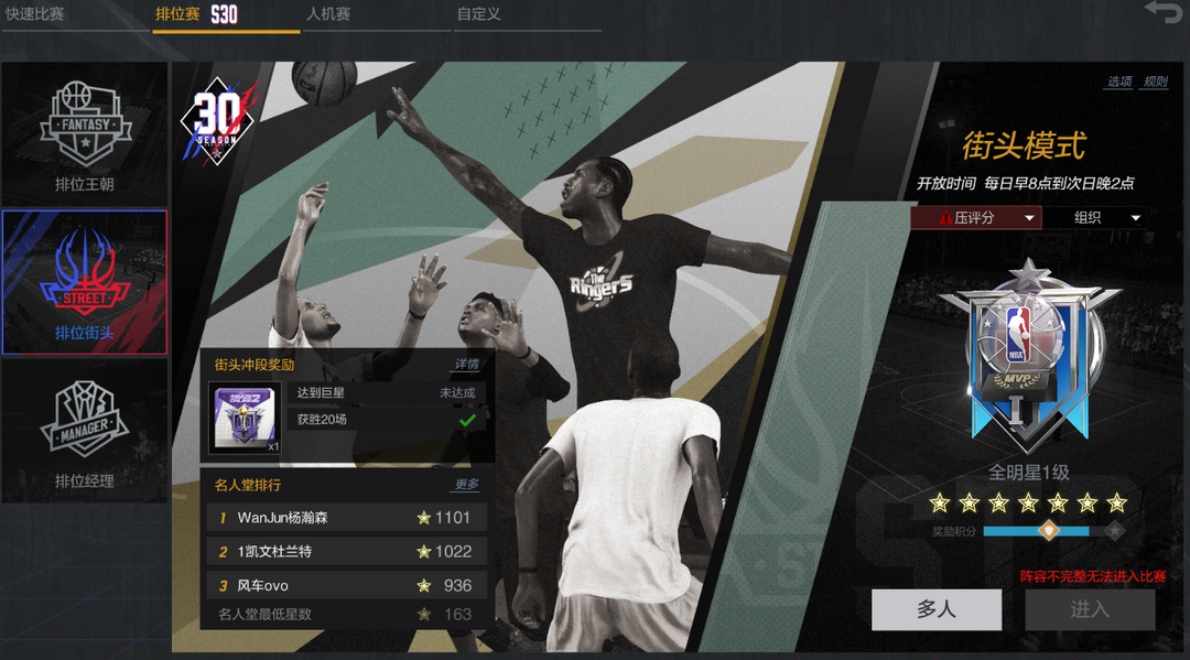 可排位,目前全明星,6突陈列室库里,5突埃泽里,4突伊戈达拉,可开满特训羁绊,可排位,