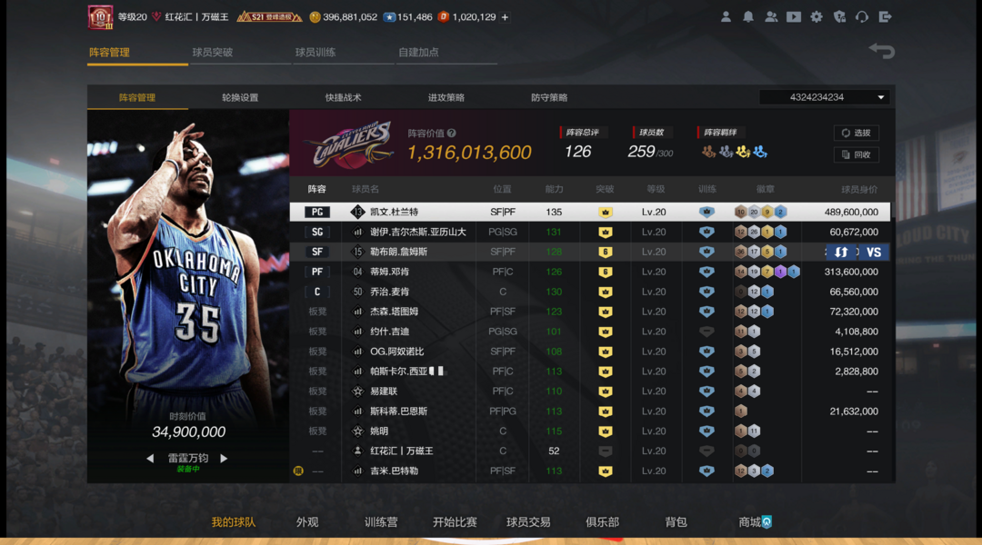 装备描述:[14e多陈列室阵容]6新邓肯满杜兰特6詹姆斯满麦肯满塔图姆满亚历阵容多服饰名人堂球馆特效 不允许动活跃度!不允许开挂!!不允许掉信誉分!一律拉黑,后果必究! 新手不要玩王朝排位,街头随意,否则拉黑!!!