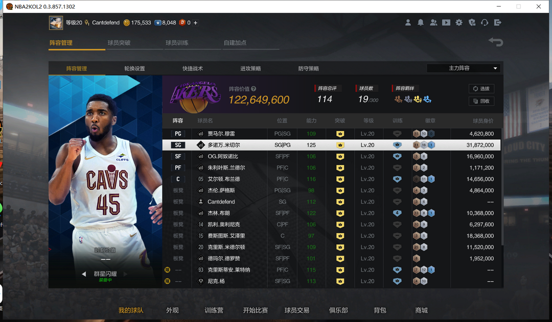装备描述:一亿两千万阵容,满突满训练米切尔(带时刻),满突满训练布兰德,满突满训练阿奴诺比,满突历史米德尔顿,满突自建SG外线封锁者,满突四训杰伦布朗,满突历史艾泽里,满突历史奥利尼克